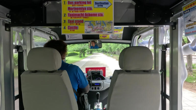 | 90°の曲がり角には石垣があり、玉造口のようだ。ここから南へ向きが変わると、南外堀越しに一番櫓が見えだす。城南バス駅では一時停車する。再び、公園の駐車場やあじさい・ウツギ園沿いの林の中を走る。エレクトリックカーのルートは「大手前→桜門→豊國神社→城南バス→馬場町」と一回りして大人300円だが、馬場町駅で途中下車する。 |