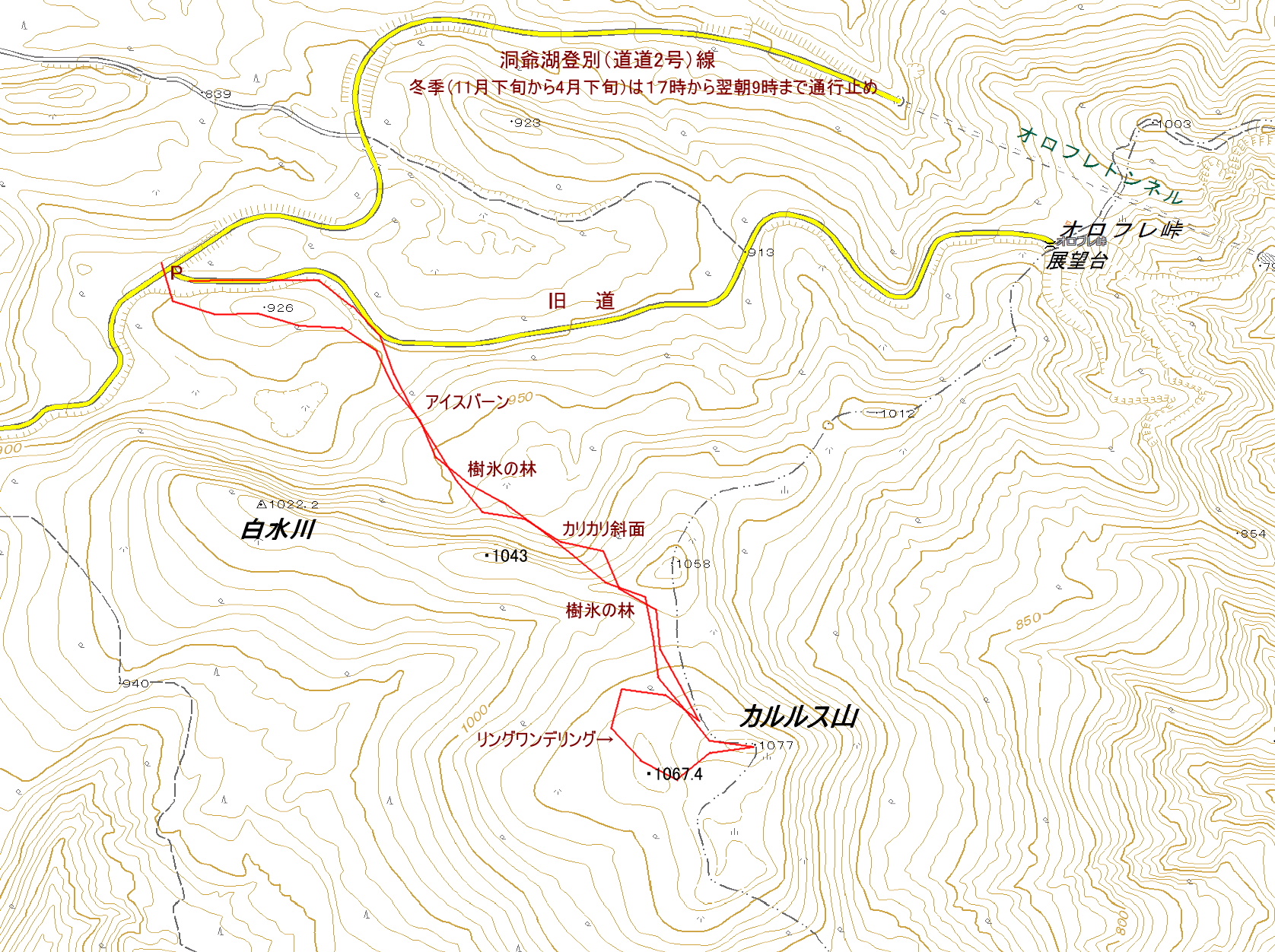 | 道路に出てしまう | 白水川P1022m | 1043と1058のコルへ | 樹氷の森 |