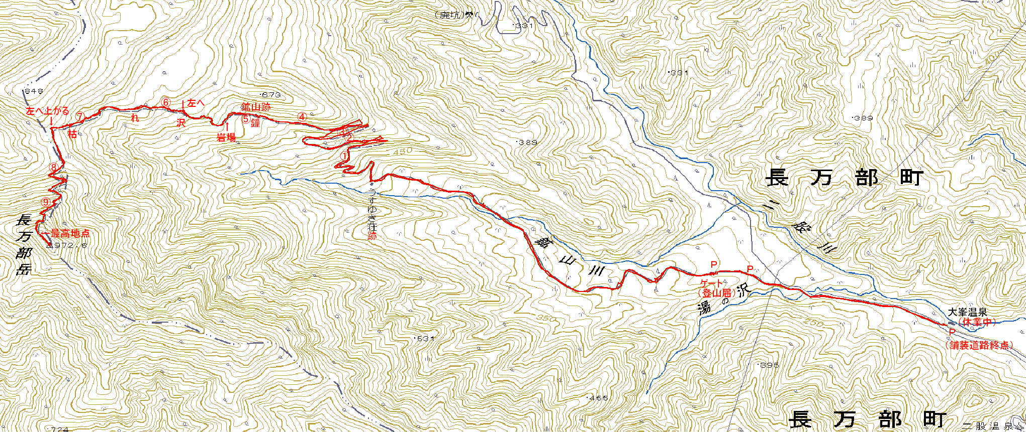 アクセス 札幌から国道5号線を走り、黒松内町を過ぎてさらに南下すると知来がある。間もなく、道標があり、二股温泉側に右折する。二股温泉まで舗装しているが、沢沿いは府県の林道のように幅が狭いところがある。退避場所を頭に入れながら徐行する。 二股温泉を左に見て、真っ直ぐ行くと、閉鎖している大峯温泉がある。すぐに舗装が切れ、砂利道となる。この砂利道を走って行くと、二股になので左に入る。送電線が出てきたら、ゲートは近い。 駐車スペースはゲートのところに6台位、送電線の下は駐車の仕方にもよるが数十台、大峯温泉前は舗装道路の路駐になる。 国土地理院地図 Google Map 登山道地図クリック大→| |