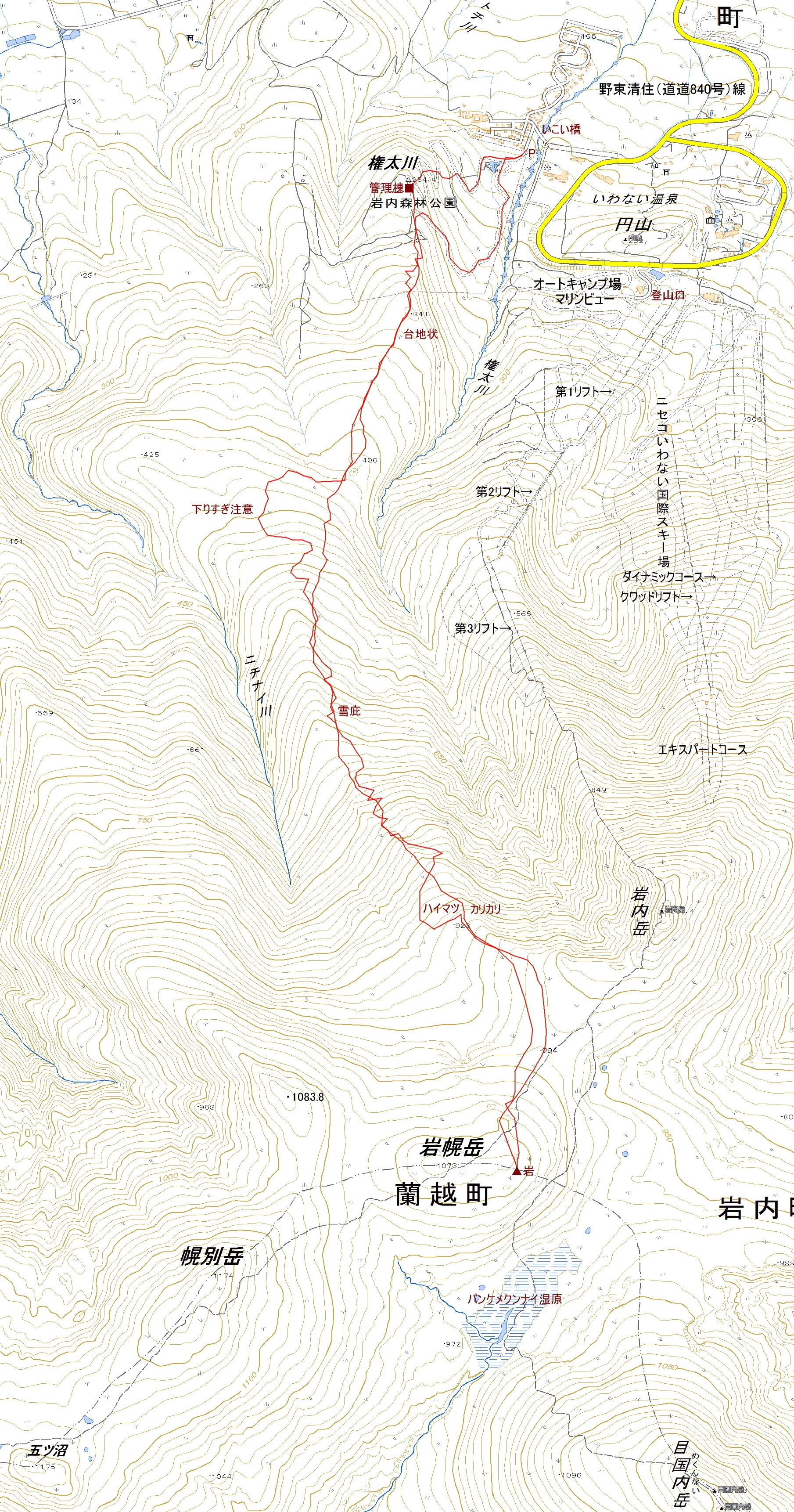 ポイント パンケ目国内川の源流となる山。岩内町のニチナイ川と権太川に挟まれた尾根を辿る。登る途中で岩内岳の尖塔が良く見える。山頂の外れに岩があり、目の前に目国内岳が鎮座している。 岩内町森林公園に下るときに、権太川沿いの枝尾根に戻るのを忘れないように。 |