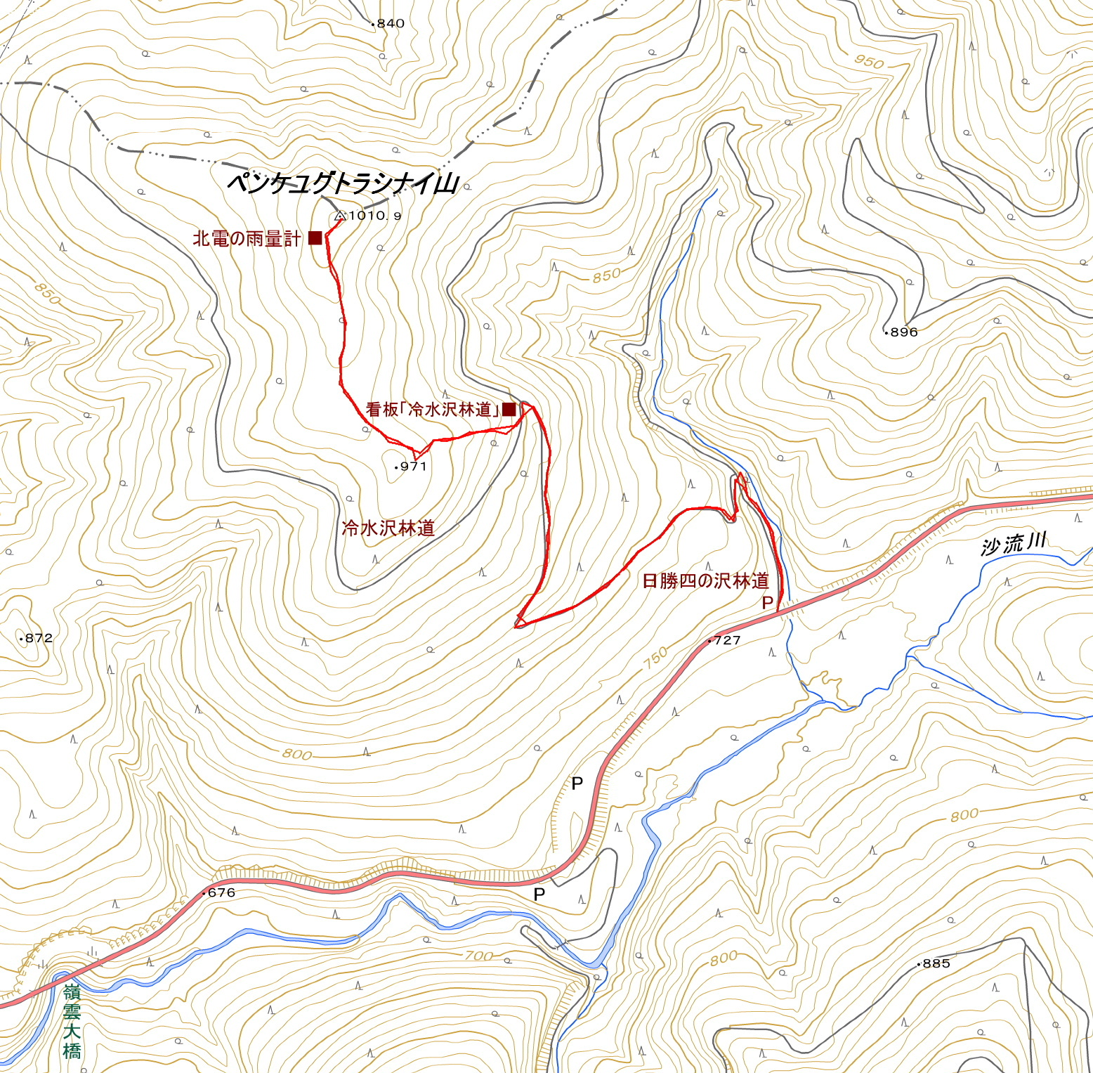 ポイント 傾斜がなだらかで幅の広い林道と、尾根取り付きの目印になる立派な看板冷水沢林道があるので分かり易いが、主稜線は平な林の中なので山頂方向が分かり難い。下りの林道は初心者には絶好のゲレンデとなる。 国土地理院の三角点:冷水沢を見ると、三角点の記の中で、所在地の俗称としてペンケユグトラシナイと記されていたので山の名前とした(1000mを越える山に沢の付く名前は可愛そうなので)。HYMLの林さんによれば、昭和6年の北海道の登山では冷水澤岳と呼ばれているようだ。 |