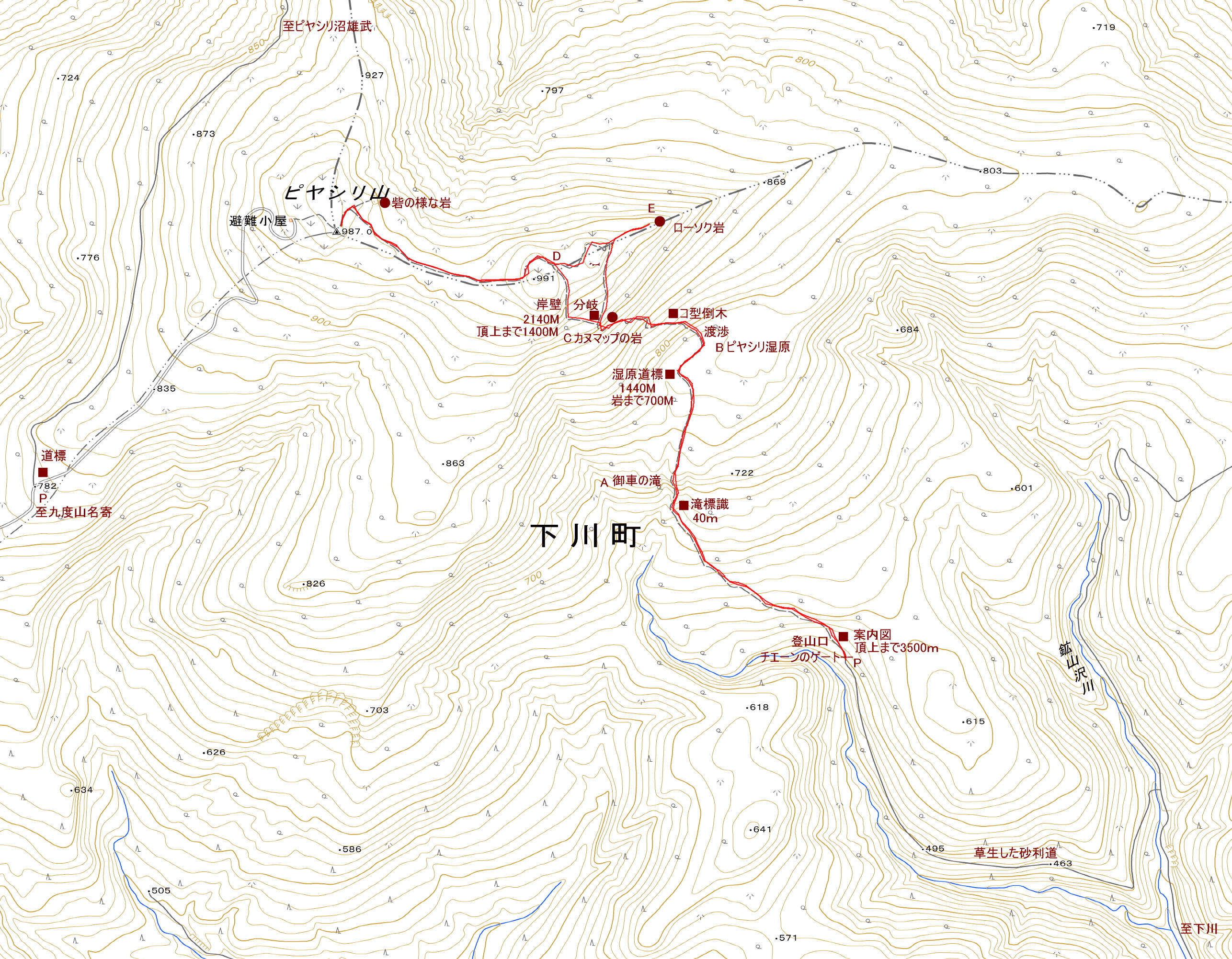 ポイント ピヤシリスキー場コース:整備された林道を走り、少し登ると頂上だ。九度山とセットで楽しむと良いと思う。 サンルコース:御車の滝、ピヤシリ湿原、カヌマップの岩、ロウソク岩等変化に富んでいる。 山頂に三角点:飛鏃岳がある。 国土地理院地図 Google Map 登山道地図クリック大→| |