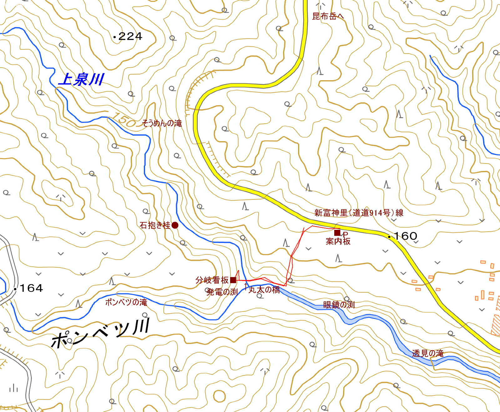 | 発電の渕 | ポンベツの滝へ | そうめんの滝へ | 上泉川 |