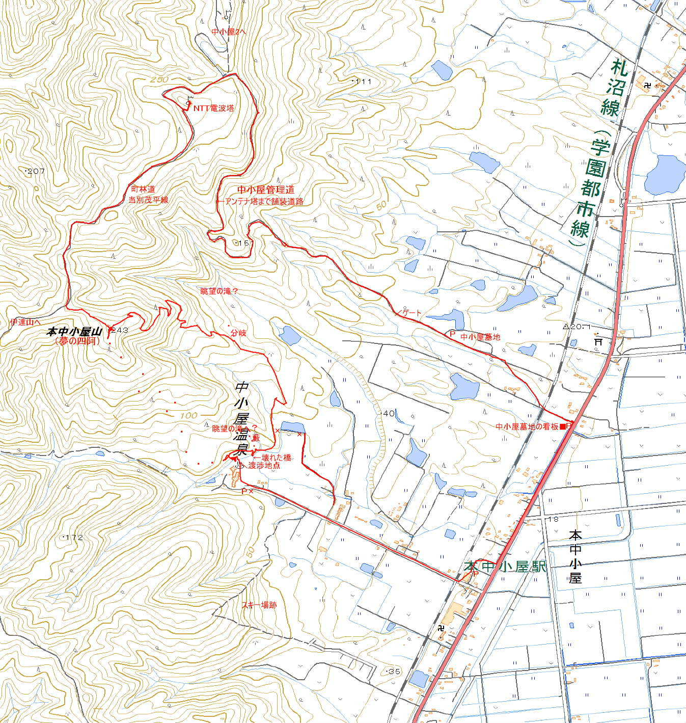ポイント 本中小屋駅から見える山のピークに愛の四阿が建ち、中小屋温泉の小川を挟んで裏手から立派な登山道が輪のように2本延びている。残念ながら、登山口への道標は無く、小川に架かる橋も落ちている。小川の護岸が2m位あるのでよじ登るか、護岸が崩れて低くなった所から渡渉する。眺望の滝への道は閉鎖され藪になってしまった。この立派な登山道は国土地理院の地図には載っていない。 |