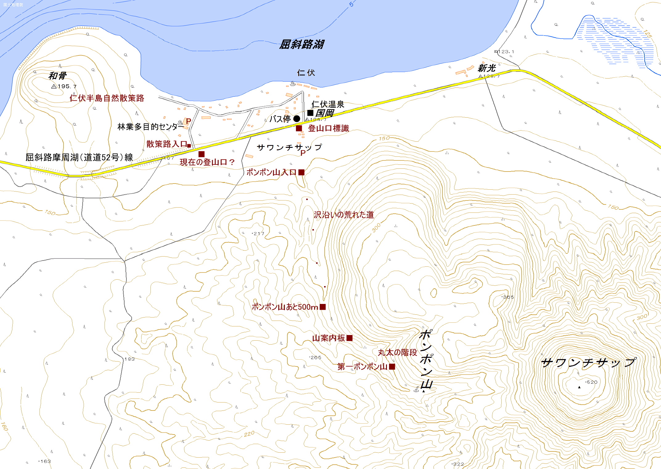 アクセス(カーナビ入力;仁伏温泉:にぶし) 国道391号から硫黄山方向へ入ると、硫黄山(508m、アトサヌプリ、三角点名:跡佐登)とマクワンチサップ(57401m)、サワンチサップ(520m)が並んで見えてくる。一番右のサワンチサップの裏にポンポン山がある。 ポンポン山の入口には仁伏(にぶし)のバス停と仁伏温泉の看板がある。この交差点から屈斜路湖が望める。交差点の山側に「ポンポン山登山口」の標識がある。 国土地理院地図 Google Map 登山道地図クリック大→| |