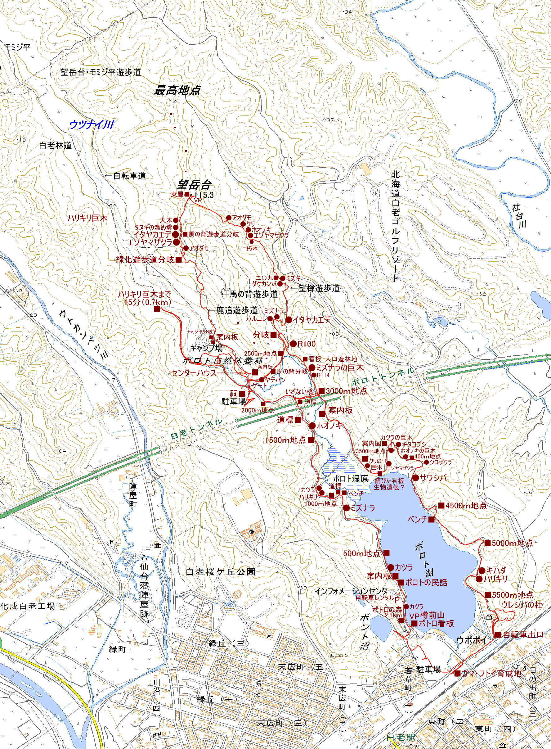 ポイント インフォメーションセンターを基点にポロト湖を一周する自転車道(時計回り)兼遊歩道約5.8kmがある。ビジターセンター(キャンプ場)を中心に白老林道約3.1km、望岳台・もみじ平遊歩道約1.8km、緑化遊歩道約0.8km、馬の背遊歩道約1.4km、鹿追遊歩道約0.8kmが網の目状に延びている。主なピークは望岳台と望岳台・もみじ平遊歩道の最高地点になる。林内には、巨木や大木が多く、樹名板も設置されている。 |