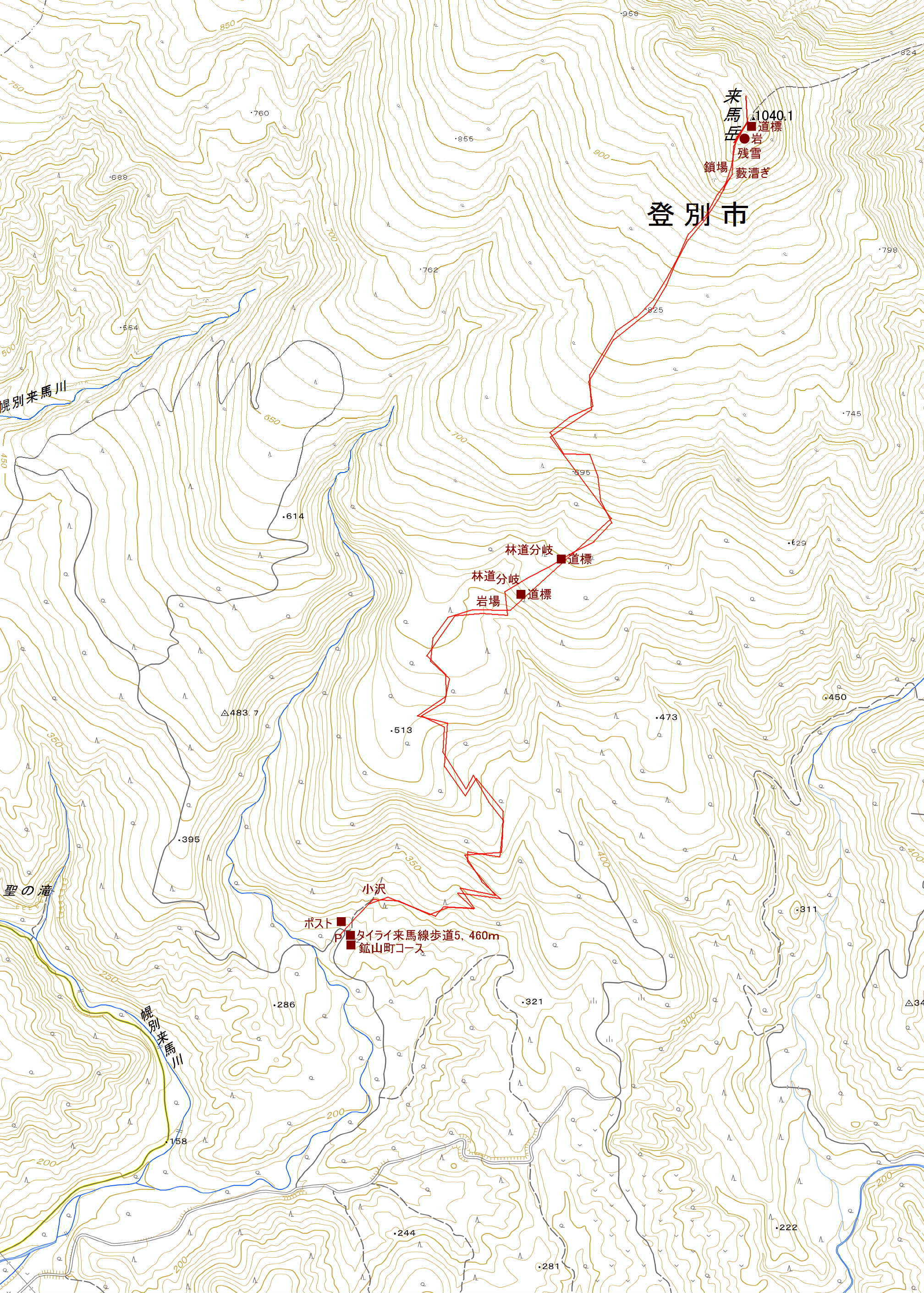 アクセス 登別市の幌別ダムの奥に進むと、鉱山町があり、幌別来馬川に架かる鉱山橋の右手前に看板がある。来馬岳の看板は小さい。 この幌別来馬川沿いの舗装道路を進むと、今度は左手に看板があり、砂利道の林道へ入る。この林道は狭いのと山菜採りの車が多いので、すれ違うときには慎重に。 |