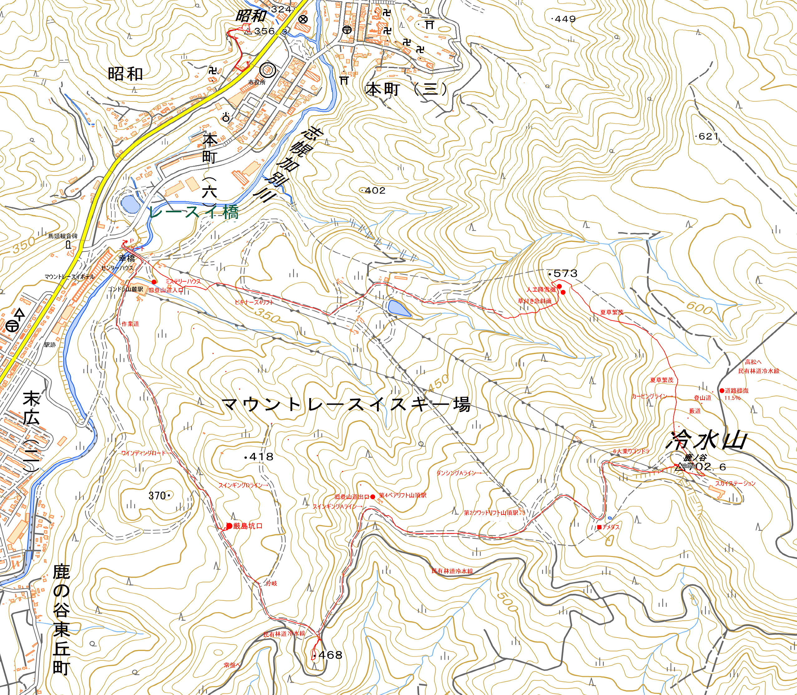 アクセス ホテルMTレイスイの奥に進むと第二駐車場があり、そこに停める。志幌加別川には豆電球で飾られた「幸橋」が架かっている。登山はこの橋から始まる。 国土地理院地図 Google Map |