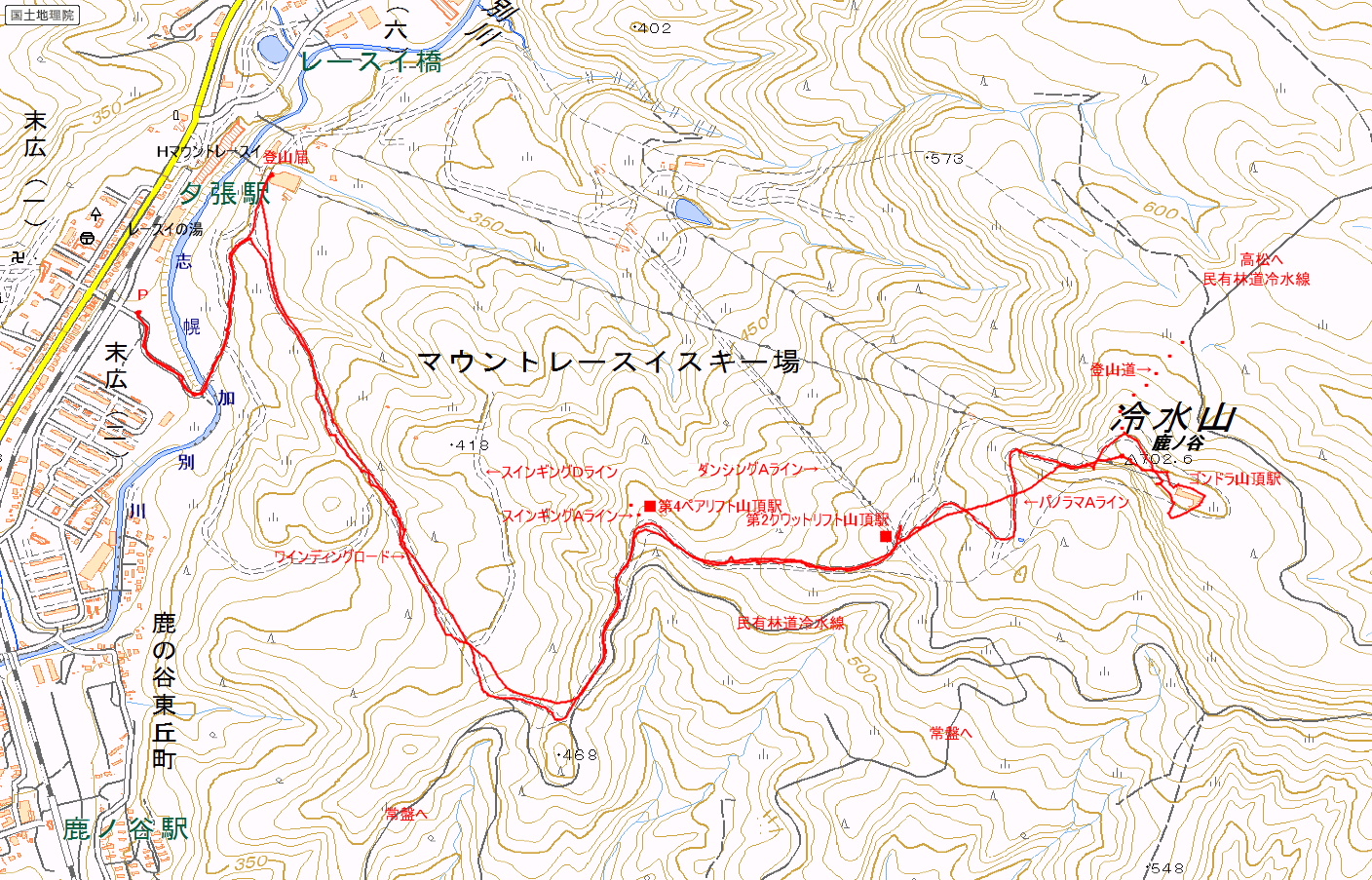 アクセス 夕張駅の南側にあるレースイの湯を目指す。レースイの湯には広い駐車場があり、その南端から志幌加別川へと下るスキーシーズンの専用駐車場への道が延びている。 国土地理院地図 Google Map 登山道地図クリック大→| |