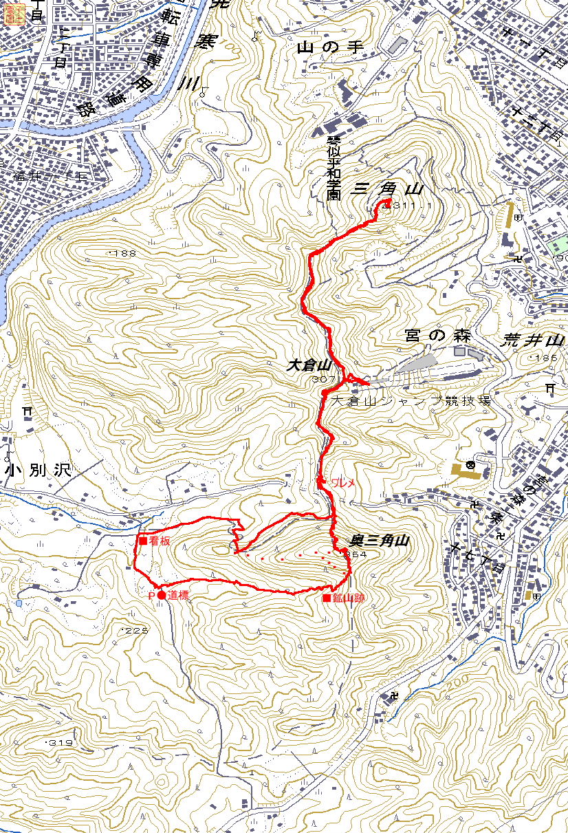 | 自然歩道入口→大倉山→三角山→大倉山→奥三角山→自然歩道入口 |