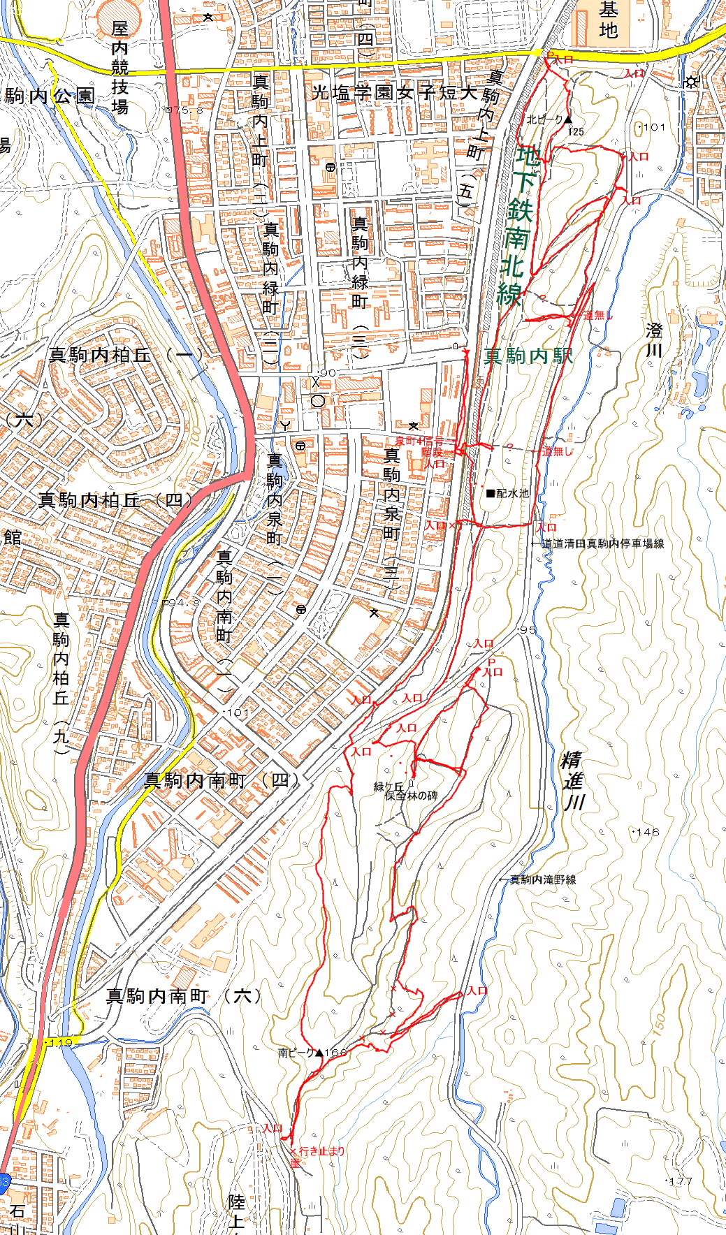 二人の山行記録 2016(H28)年5月15日(日) 曇り 一周11.122km 3:06 13:21真駒内駅→12:26階段入口→13:30一旦配水池→道路沿いの道を→13:342道路横断→13:45尾根道へ→14:00南ピーク→1405南端の入口→14:09分岐→14:14分岐→14:17道路の入口→14:22分岐→14:30分岐→14:32尾根へ→14:38分岐→14:43分岐→14:45尾根分岐→14:46石碑(尾根分岐)→14:53中央口→14:51分岐→14:59分岐→15:02石碑(尾根分岐)→15:07道路へ→15:09林道へ→15:16配水池前から東へ→15:17道路へ→15:27藪漕ぎで遊歩道へ→15:31尾根道へ→引き返し→15:37分岐→15:441尾根道へ→引き返す→15:46分岐→15:50入口→15:53入口→15:57尾根道へ→16:02五輪通り入口→16:04尾根道分岐→16:10分岐→16:16分岐→16:18地下鉄沿い→16:23一旦尾根道へ→16:24階段入口→16:27真駒内駅 |