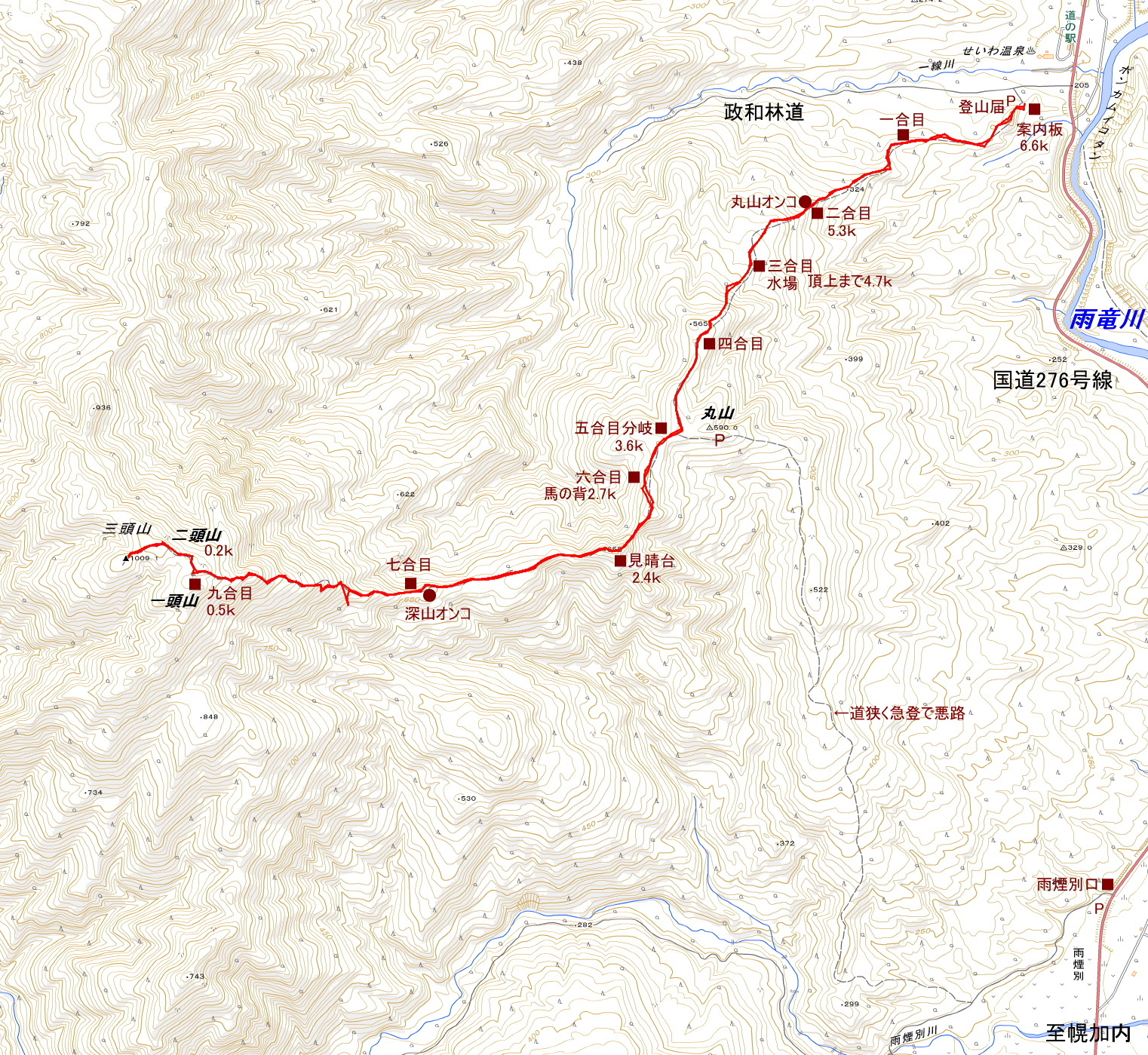ポイント 登り口は誠和と雨煙別にあり、丸山(590.2m)で合流する。雨煙別からは林道の荒れ方しだいだが、丸山まで車で行ける。 |