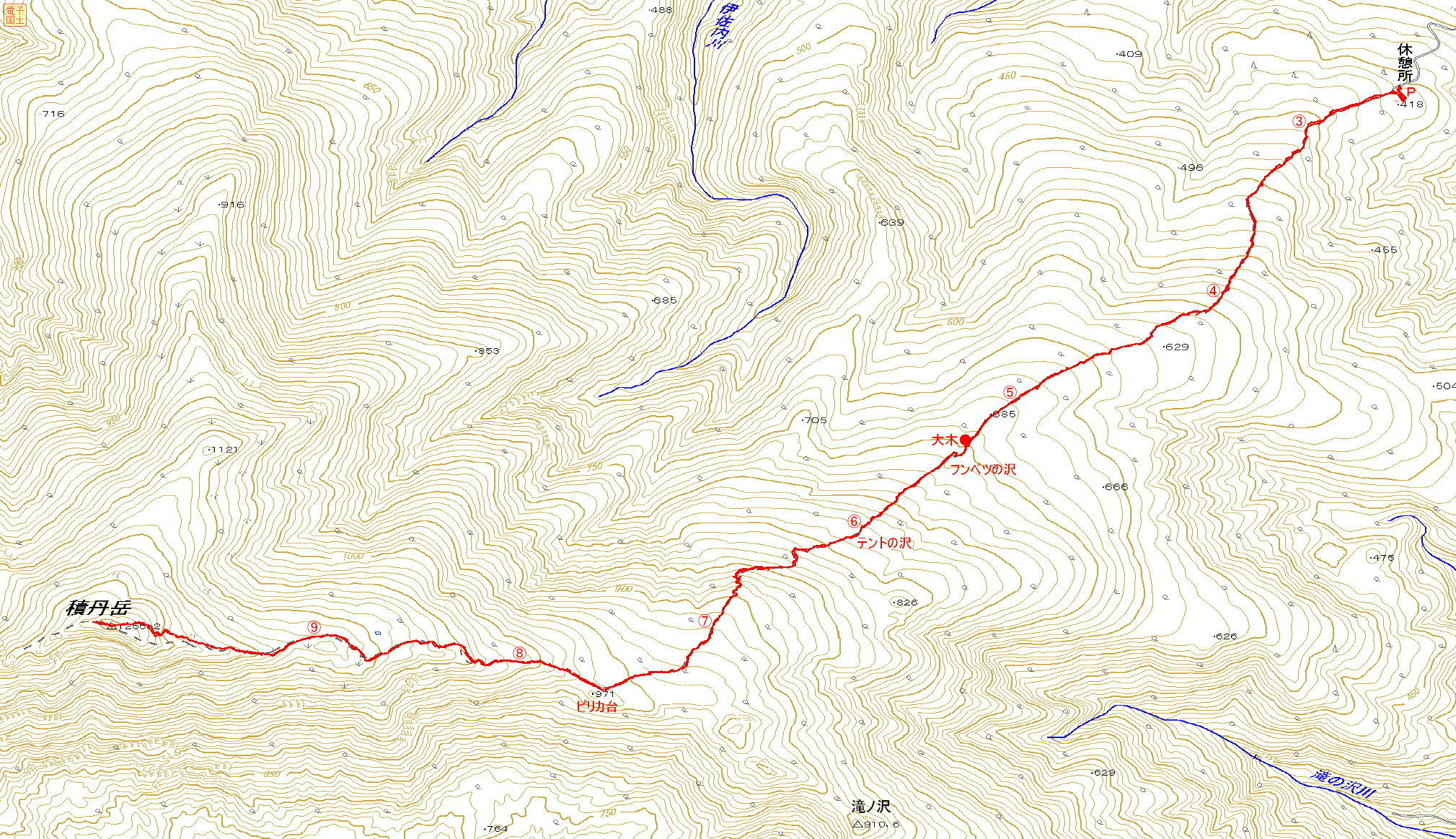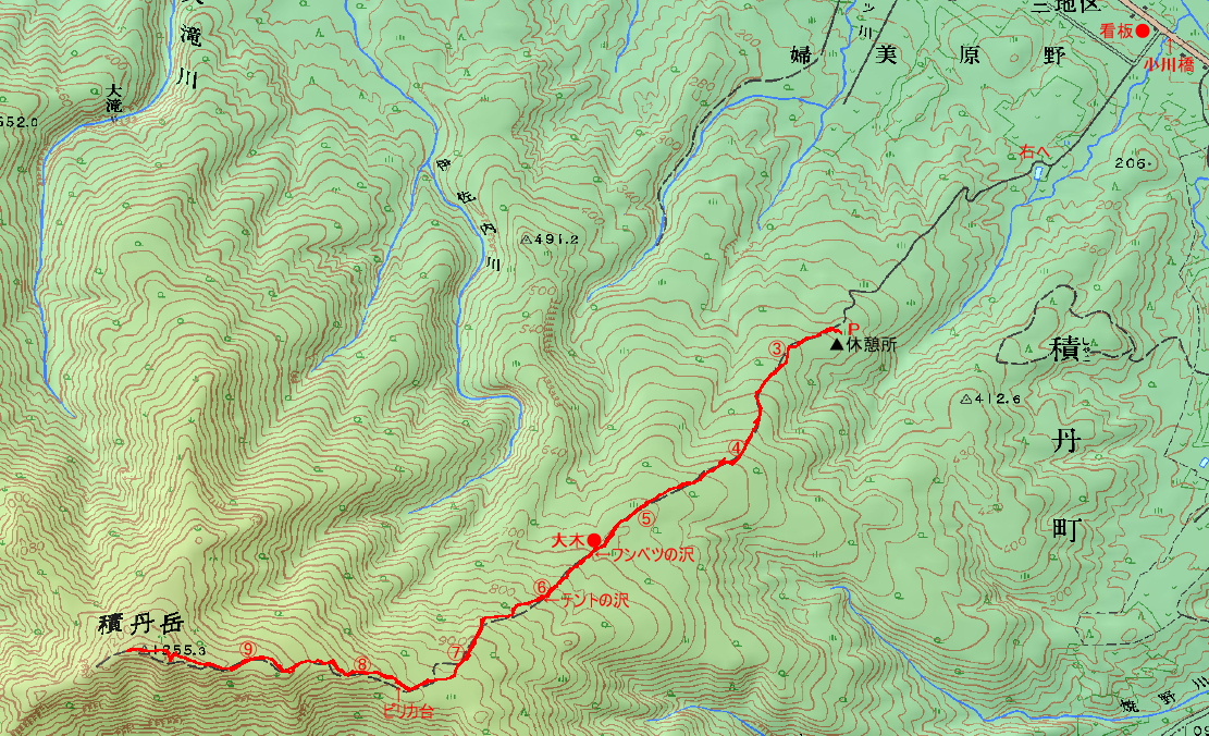 アクセス 国道229号線を走り、積丹町の婦美町にある小川橋を渡って直ぐに、登山口の看板があり左折する。この舗装道路は農免道路で、ヘリコプタースキーの標識もある。山に向って道を辿ると、浄水場の分岐に「登山口は右」の道標あり、それに沿って進む。ここから砂利道になるが林道は良く整備されていて休憩所に着く。休憩所には詰めれば10台は置けるスペースがある。登山届けは休憩所の中にある。 国土地理院地図 Google マップ |