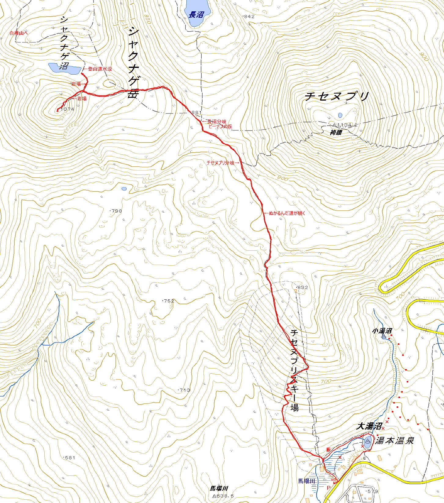 | シャクナゲ岳(1075.2m) シャクナゲ沼(975.8m7600u) 大湯沼(556.3m2400u) |
