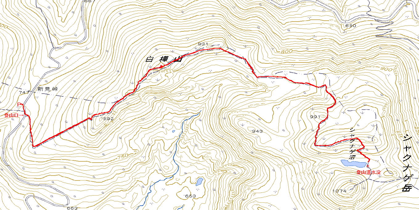 ポイント 新見峠からのシャクナゲ岳へ行く道は、春先や長雨で増水している時には、シャクナゲ沼の辺で水没していることがある。 |
