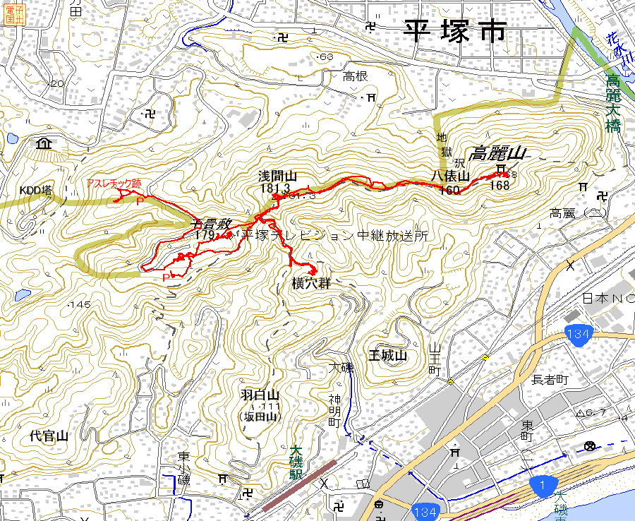 ポイント 湘南平(しょうなんだいら)は浅間山を最高ピークに、千畳敷、八俵山、高麗山(こまやま)、王城山、羽白(坂田)、代官山、KDD塔の山が集まった山塊になっている。湘南平は、大磯南本町の医師杉原惣治郎が明治時代に開発したもので、古くは「泡垂山(あわたらやま)」、山戦時中は「千畳敷山防空砲台」と呼ばれていたようだ。アスレチックは撤去されていた。 |