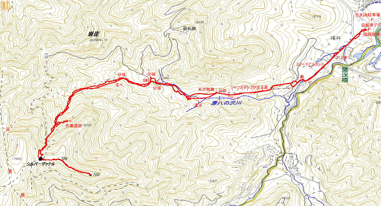 ポイント シルバーザッテルは何かを期待させる心地よい響きがある。ドイツ語だが日本語では銀の鞍のこと。因みに、765m峰が後橋、719m峰が前橋、シルバーザッテルが騎座ということか。 源八の沢の林道はスノーモビルランドのコースだが、既に営業を終えていた。その代わりに採石場のジャンボダンプカーが砂塵を巻き上げて走っていた。 |
