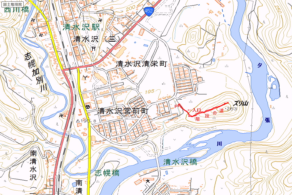 アクセス 道路標識は無いので、JR清水沢駅の南東を目指し、木段の延びた小高い丘を探す。夕張に行く場合は国道452号線ではなく、JR石勝線沿いの夕張岩見沢(道道38号)線にはいること。 国土地理院地図 周辺地図 登山道地図クリック大→| |