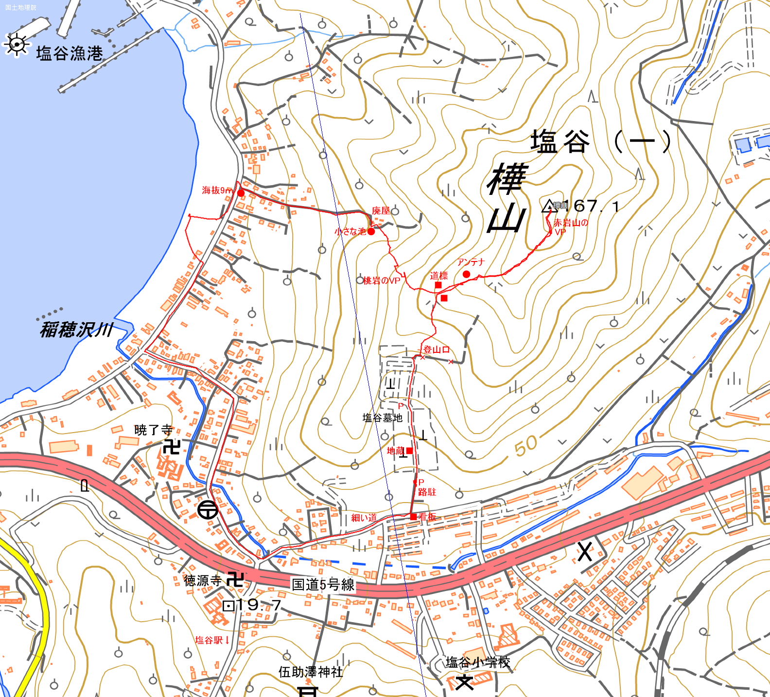 ポイント 塩谷海岸に近いので、海辺をセットで楽しめる。山頂からは、僅かに赤岩山が覗ける。登山道は、墓地側と海側の2コースある。 |