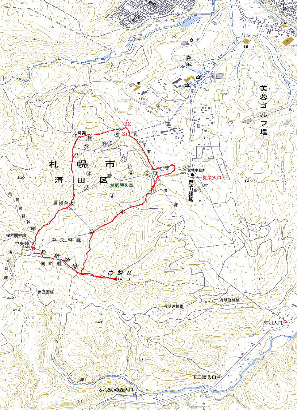 ポイント 目印となる山が見えない低山の上、スキーコース、林道、遊歩道が網の目に交差しているので、入口や途中にある道標と地図を確認しながら辿ると安心だ。三角点は山頂に南通321.2m、北尾根に月寒239.4mがある。 |