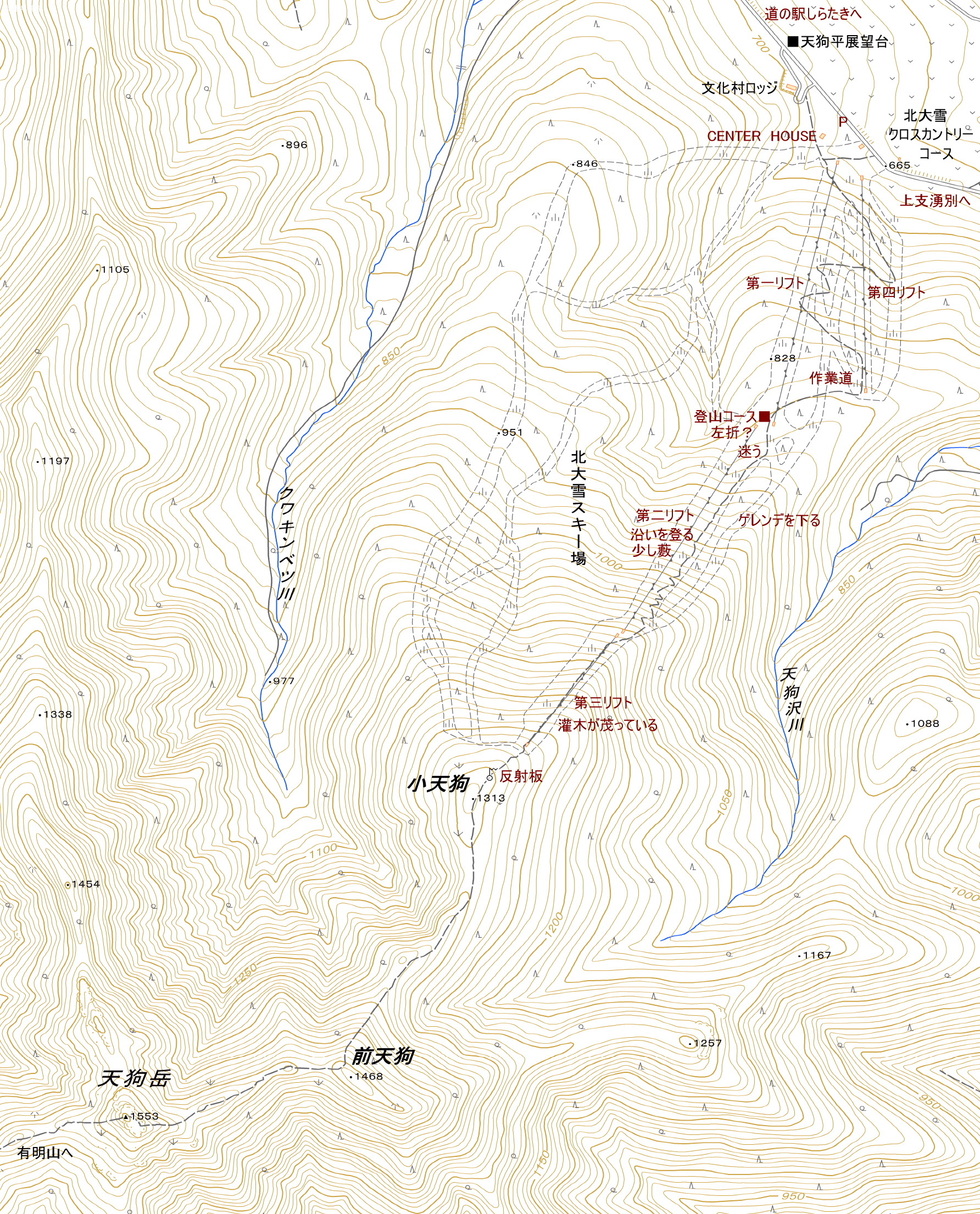 アクセス 旭川紋別自動車道(国道450号線)の奥白滝IC(道の駅しらたき)から北大雪スキー場を目指す。 国土地理院地図 Google Map 登山道地図クリック大→| |
