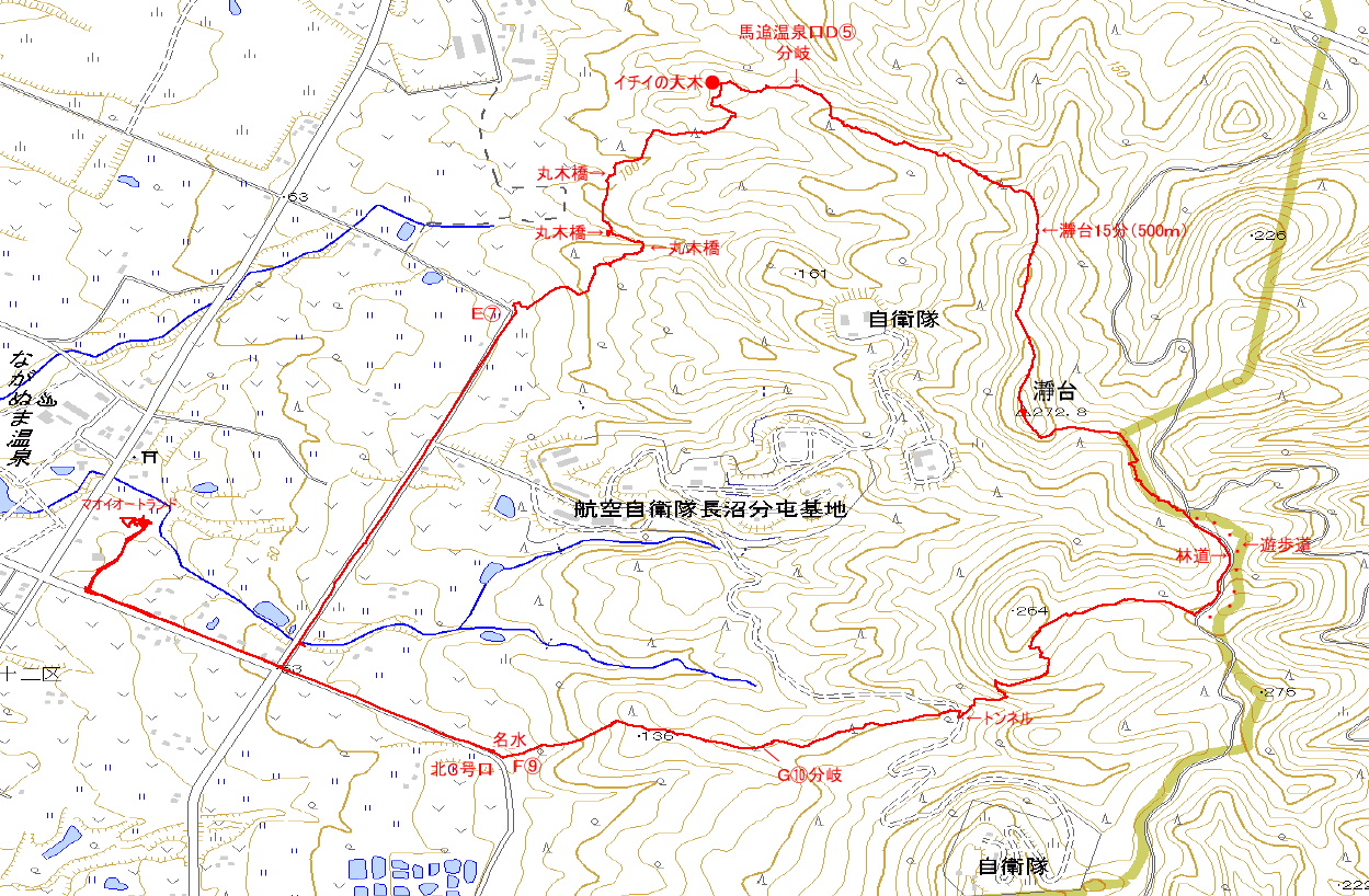 ポイント 馬追山は馬追自然の森と呼ばれ、南北に大小のコブが連なった長い丘陵になっている。名のあるピークは瀞台(272.7m)と長官山(254m)がる。丘陵の最高地点は国土地理の地図では275だが、L分岐(286.4m)ではないかと思う。瀞台には、遊歩道が延びていて、登り口は馬追温泉DD口、馬追コミュニティーセンターEF口(閉鎖中)、北3号FH口、道道夕張長沼線GI口の4か所で林道は数本ある。 |