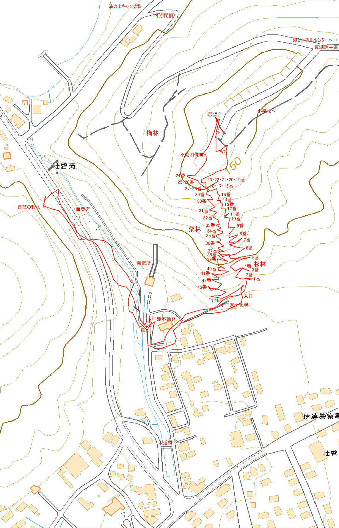 アクセス 壮瞥滝の駐車場に駐車する。滝不動尊の中から東に行くと石仏群が鎮座している。ここから、石仏を角々に配置している参道が展望台へと延びている。一番目の石仏から番号順に登るには、馬頭観世音の奥にある入口を目指す(道標が無く分かり難い)。 国土地理院地図 Google マップ 登山道地図クリック大→┃ |