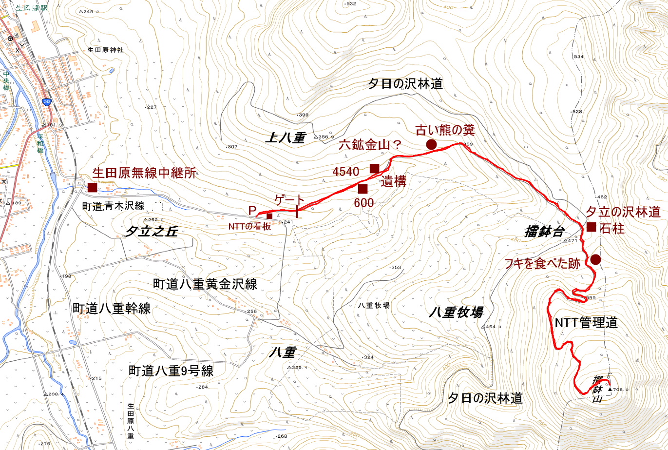 アクセス 生田原の生田原川に架かる平和橋の袂に延びる道路に入り、踏み切りを越えて、直ぐ左に曲がる道がある。その道には「生田原無線中継所」の看板が立っている。この道路を辿ると、NTTの立派な看板のある夕立の沢林道に繋がる作業道入口に着く。中にゲートがあるので、入口の道端に停める。 国土地理院地図 Google Map 登山道地図クリック大→| |