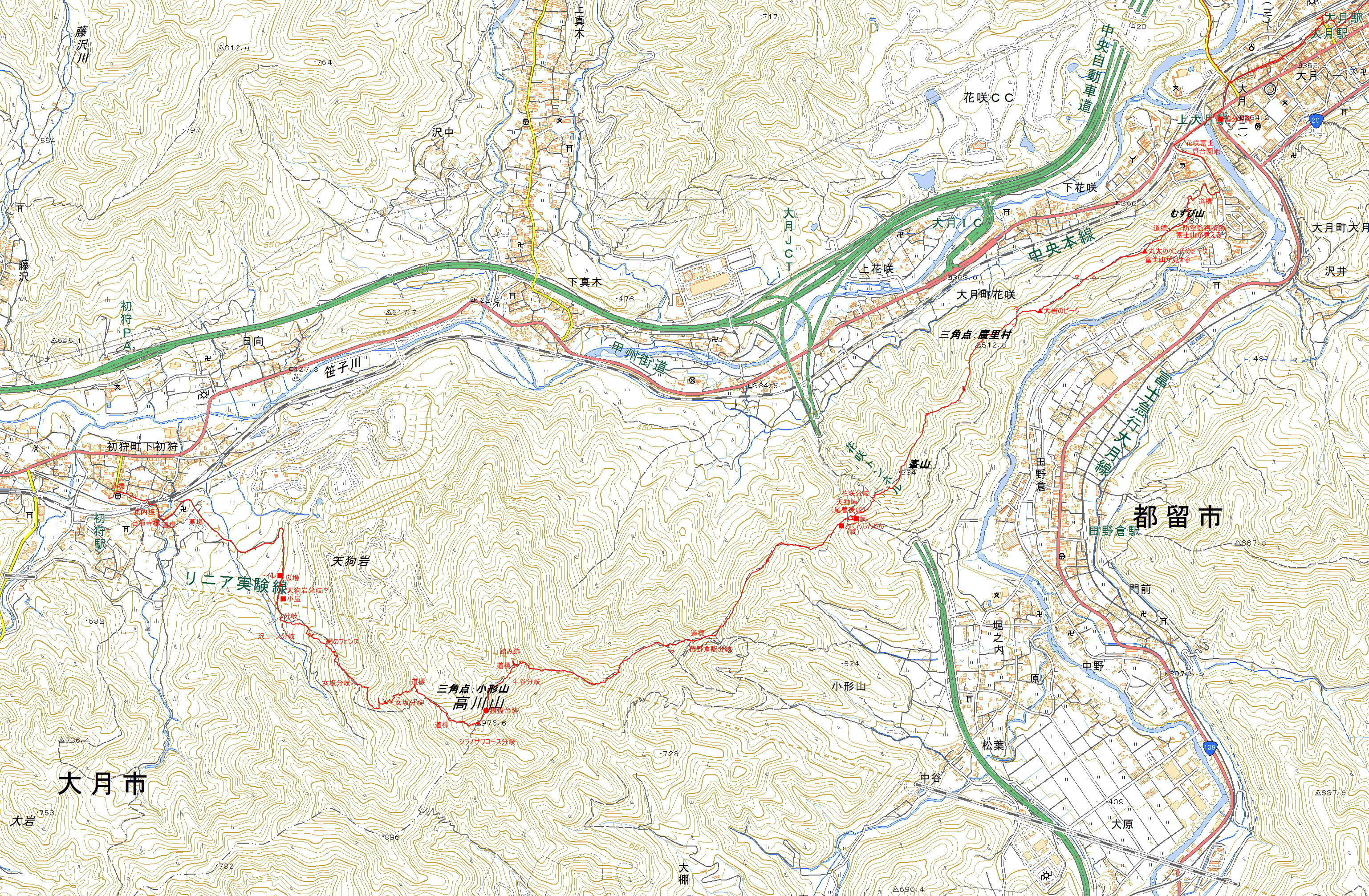 アクセス JR初狩駅を目指す。 国土地理院地図 Google Map 登山道地図クリック大→| |