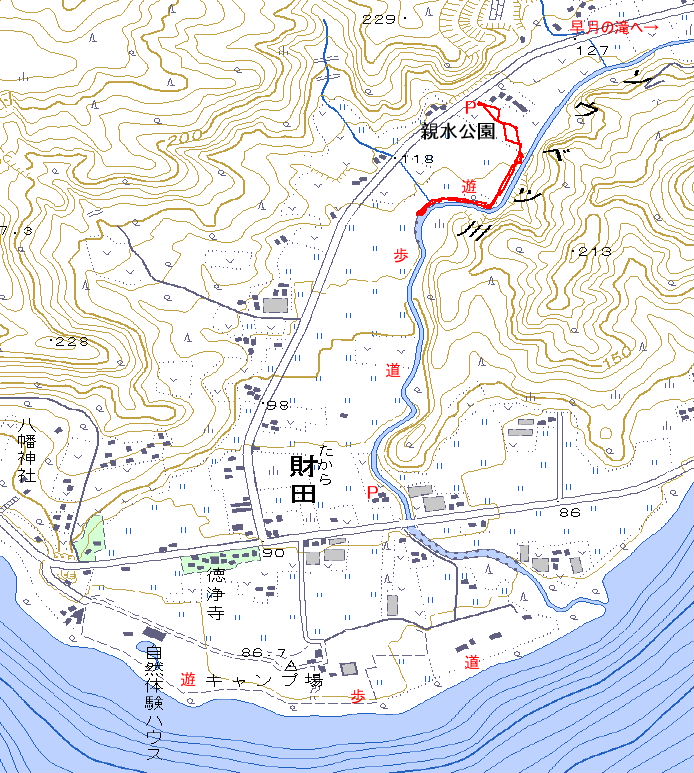 アクセス 洞爺湖の東湖畔に延びる道道132号線(洞爺公園洞爺線)の北に位置する財田に「早月の滝」の標識を見つけ、ソウベツ川沿いの道を辿る。舗装が切れる所に冬期交通止めの標識があり、引返し親水公園に立ち寄る。 Google Map 遊歩道地図(2009.5.7)大→| |