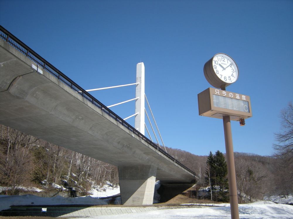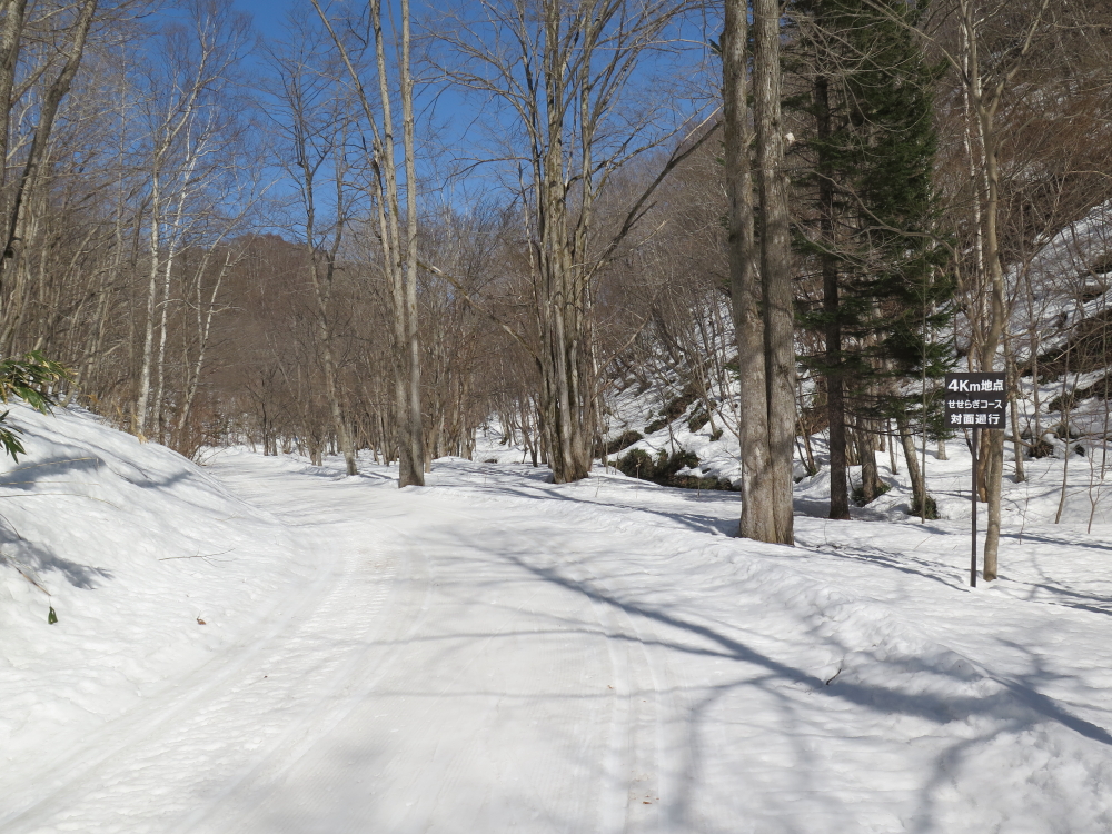 | スノーマラソン5kmのゴール地点で愛棒に見送られて出発する。パークブリッジを見上げると10時9分を指していた。所々にマラソンの距離標識がある。右側通行のはずだが、カンターは一本しか見当たらないので溝の中を滑り歩く。鱒見の滝900mの道標があったので写そうと止まるが、カッターから出られずスキー板をひっかけて転んでしまう。カメラを持ったままなので、なるがままに任せて横たわる。まず、カメラをしまい、おもむろに起きようとするが、平らな所で起きるのは大変。もがいていたら、後続者が近づいて来て助け起こして頂いた。 |