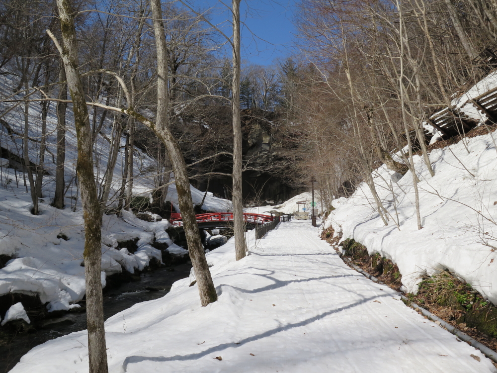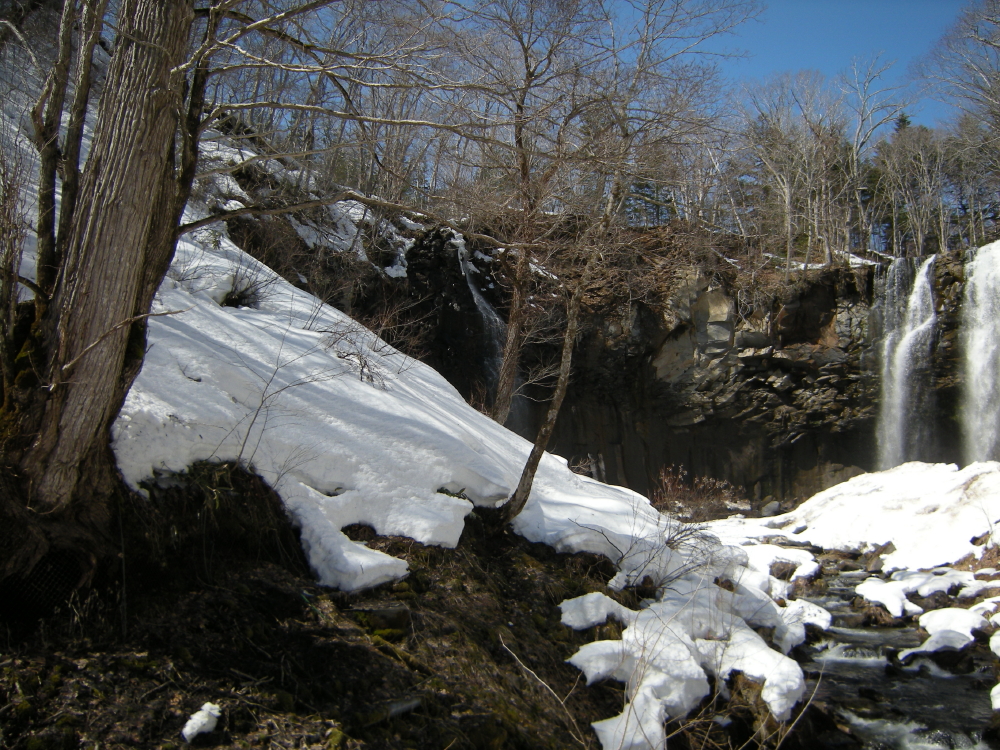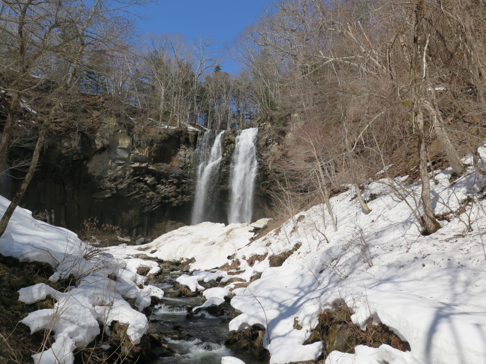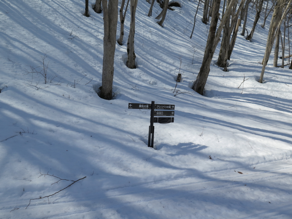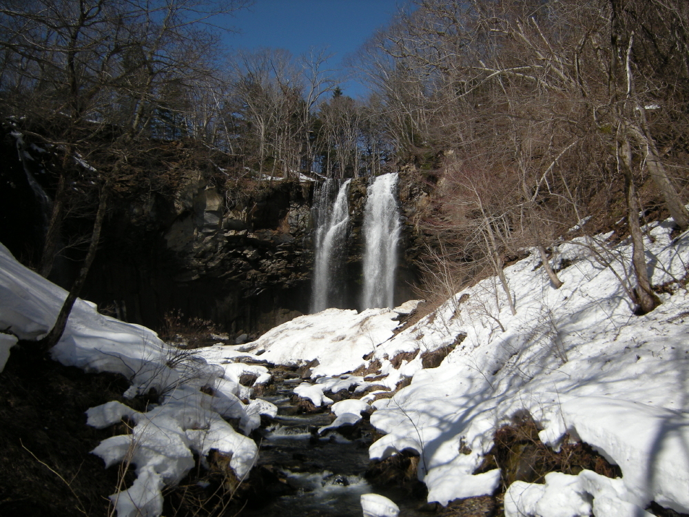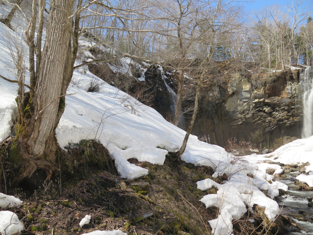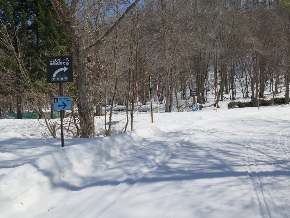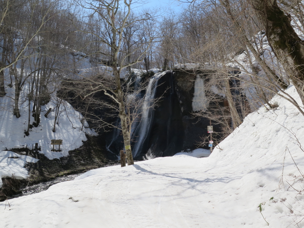 | こんどは後続者が先行するが、落ち枝に引っ掛かり転倒していた。お返しをしようと近づいて行くが、難なく起き上がって落ち枝の処理をしていた。その傍を通り過ぎて、交互通行の看板を写していると、また追い越して行く。3ピンのスキーはヒールが上がるので歩きやすそうだった。私のは3ピンより幅広でケーブルなのでヒールはそこ迄は上がらない。先行者が下って来たので、お礼を言ってすれ違う。いよいよ鱒見の滝が見えだして来る。まだ、本格的な雪解けシーズンではないので水量は少な目に感じた。丁度、流れ落ちる水に日の光が当たって輝いて綺麗だった。 |