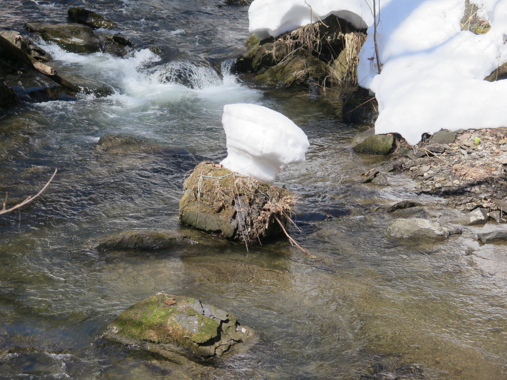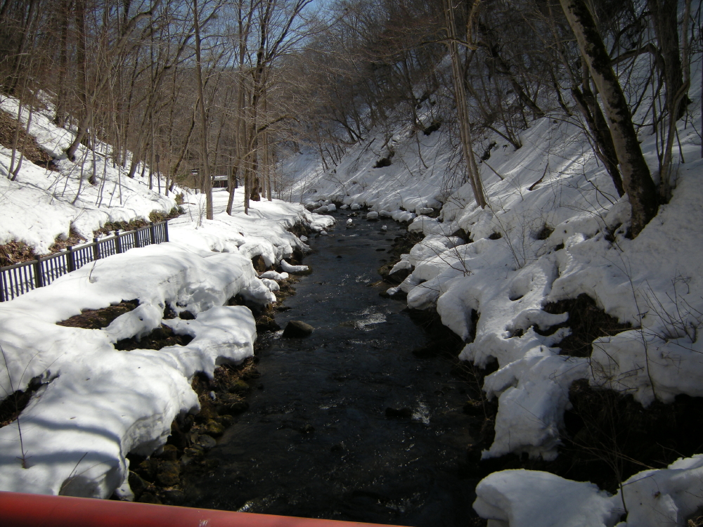| 女滝の水量も少ないようだ。川の中には取り残された雪が、春の陽気に負けないように必死で頑張っている様に思えた。滝見橋から厚別川を眺め、看板群を振り返り引き返して行く。 |