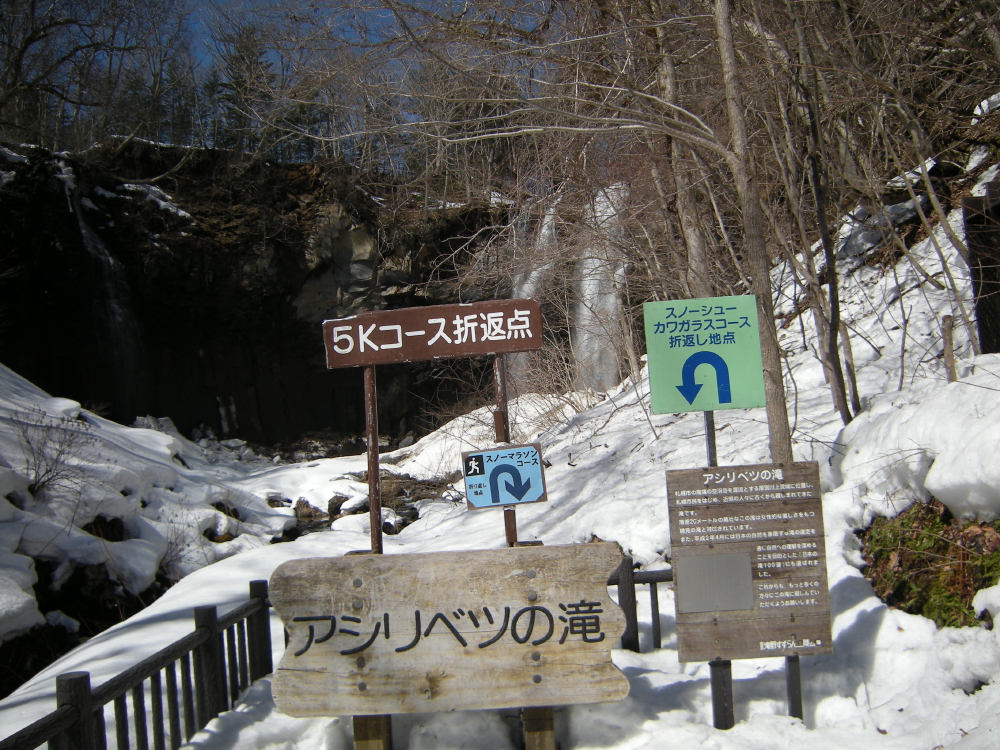 | パークブリッジ下のスノーマラソンスタート地点が見えて来る。ここで止めるかアシリベツの滝まで行くか悩んで愛棒に電話をする。まだ、待って居られるというのでアシリベツの滝を目指す。不老橋、アツベツ橋と渡って行くと、台湾の御一行と思われる一団にであう。アシリベツの滝は二筋に分かれて落ちていた。 |