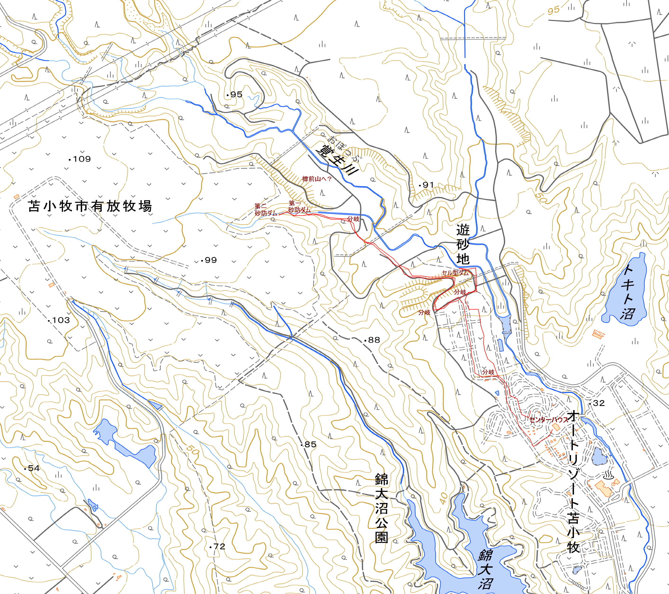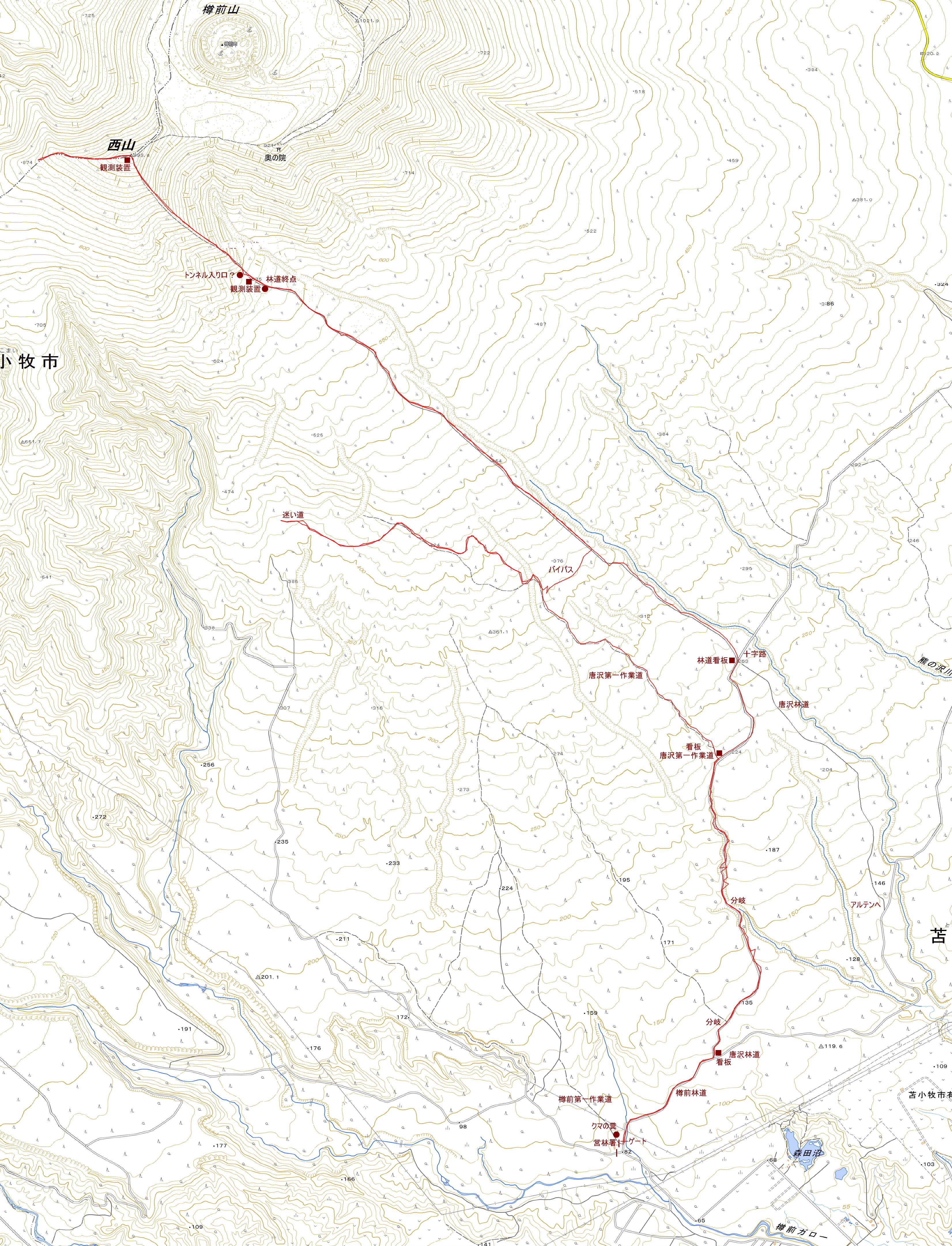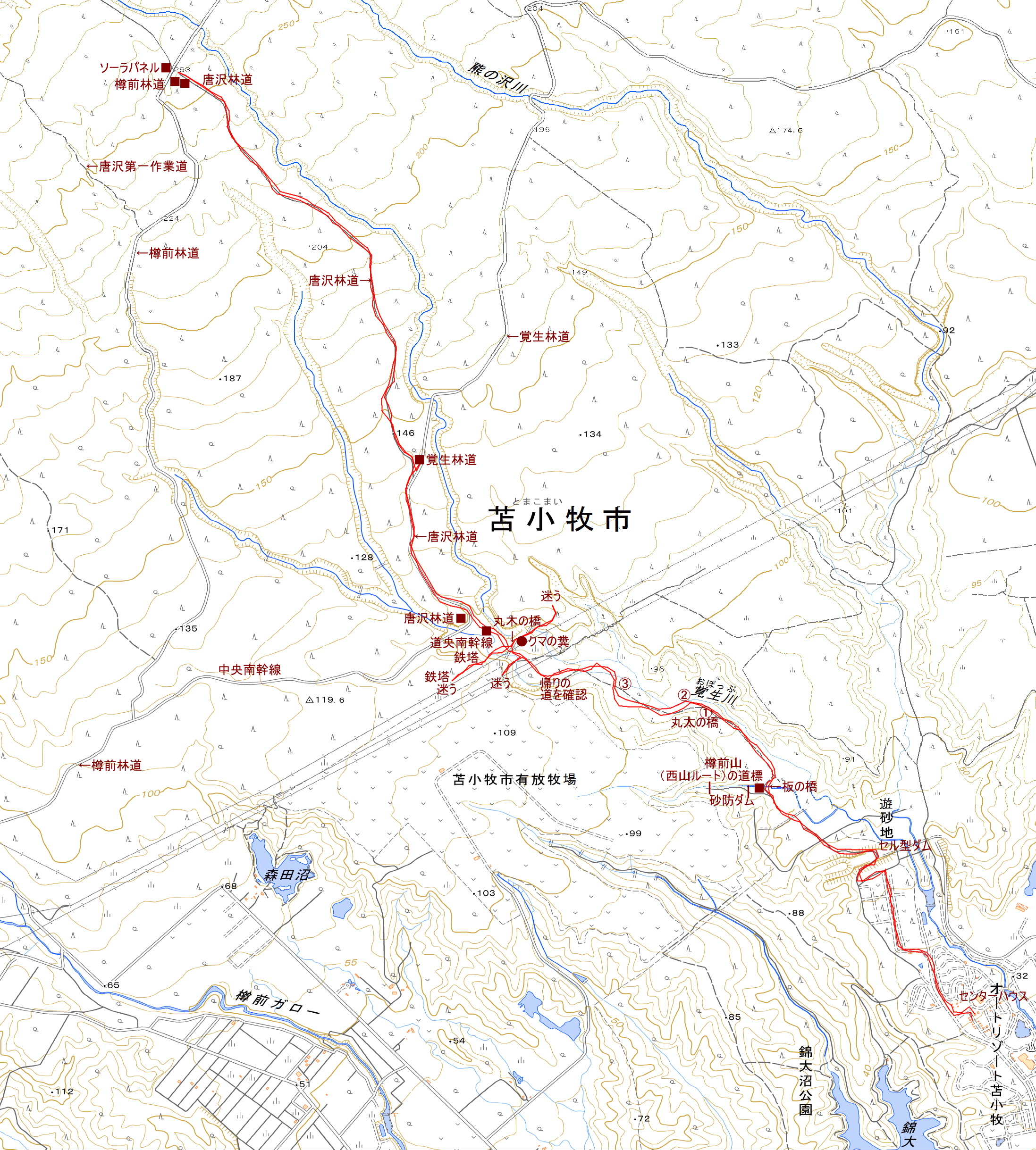 | =林道考= 樽前川に架かるガロー橋を渡ると、社台横断林道になり営林署の左に伸びている。ガローの営林署跡?には3つのゲート付き林道と作業道がある。一つ目は左の「社台横断林道」、二つ目は中央の「樽前第一作業道」、三つ目は右の樽前林道だ。 樽前林道を辿ると、途中で唐沢林道が右に分岐する。更に樽前林道を進むと十字路の手前で唐沢第一作業道が左に分岐する。これを辿ると、社台横断林道から北に派生する道に繋がり、西山には行けない。唐沢第一作業道と唐沢林道には短絡路がある。 |