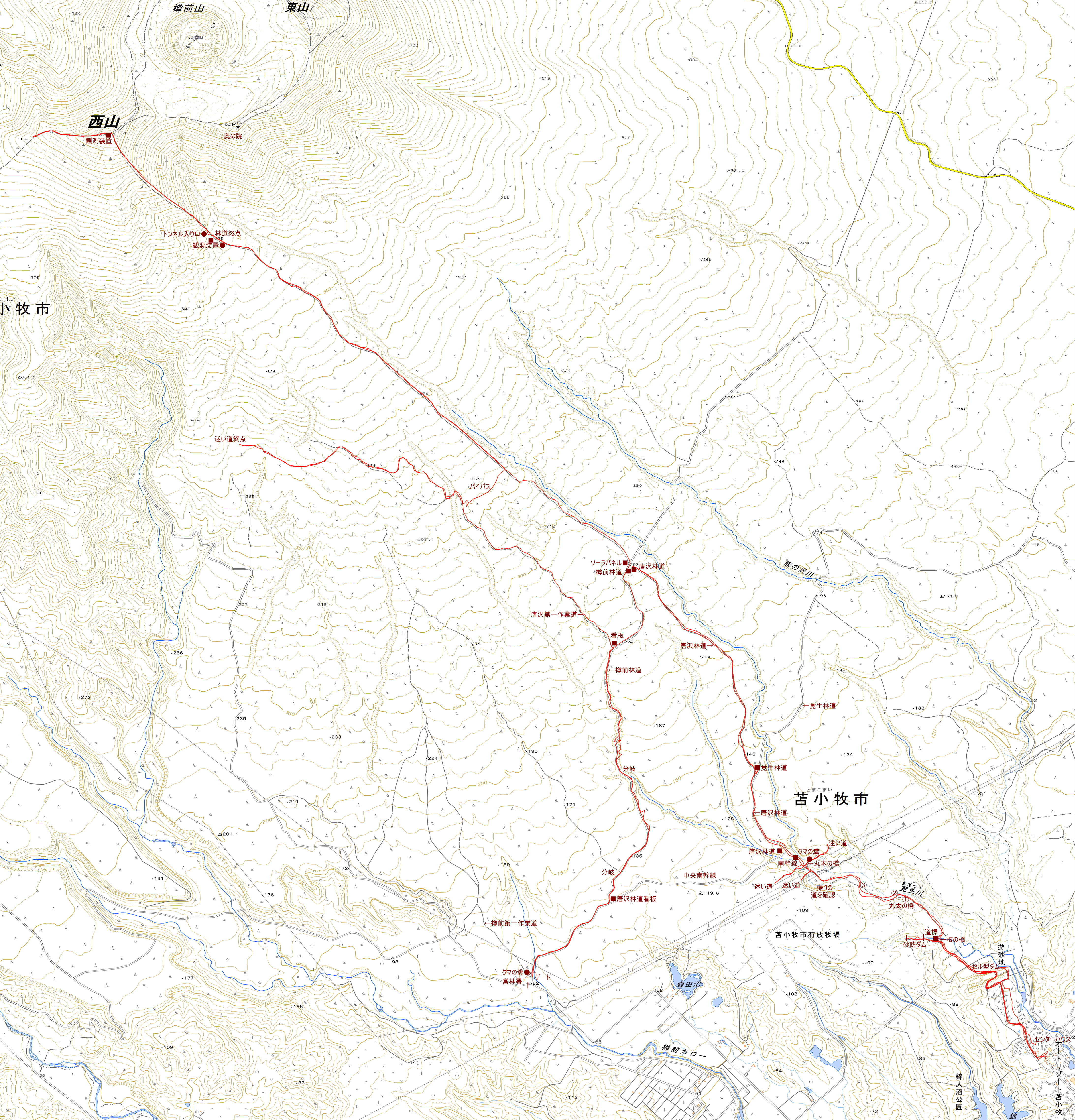 | 樽前林道(ガロー)コース 2005(H17)年7月23日(土) 曇り時々晴れ 西山まで24.026km 登り4:33(3:28) 下り2:26 7:32登山口→7:45唐沢林道標識分岐(左)→8:23唐沢第一作業道(左)→8:54バイパス分岐→9:31引返し地点→9:59バイパス分岐(1:05ロス)→10:05唐沢林道復帰→1104林道終点→12:05西山12:52・西山の東尾根散策13:08→13:33林道終点→14:14バイパス分岐→14:32唐沢樽前林道交差点→15:18唐沢林道標識分岐→14*14唐沢第一作業道分岐→15:34登山口 |
