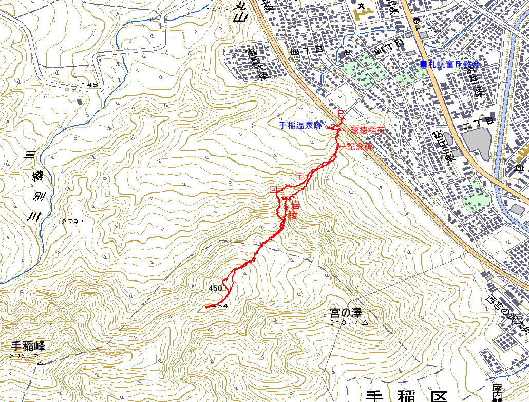 アクセス 手稲から国道5号線を札幌方向に走り、右手の宮越家具から南19条宮の沢線に右折する。札樽道を潜って、すぐ右側に真っ直ぐ山に向かう道があり、左折や右折をしながら分譲地の一番上まで行って車を停める。 |