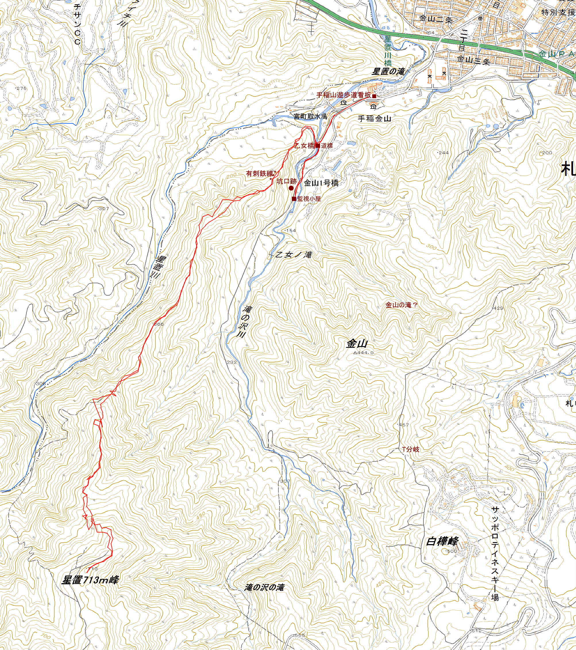 | 気を取り直して、プラブーツを履いた格好で、一世代前のロボットの様に、金山線をぎこちなく登って行く。再び、宮町取水場の入口に戻ると、真正面に961m峰(950m峰)と713m峰が見える。あわよくば、961m峰まで登るつもりで見ていた。滝の沢川沿いの遊歩道に入ると、看板があり林道の工事は12月で終わっているようだったので、奥へ進む。作業道へ上がると道は除雪されていた。道には小砂利が浮き出ていて、スキーが可愛そうだった。滝の沢に架かる「金山1号橋」を渡ると、監視小屋があり車が1台停まっていた。小屋から監視員が出てきて、「ここは私有地で、日曜日以外は工事車両が走っているので駄目だ」と言う。看板には12月までになっていると言うと、追加予算が付いて工事を3月まですると言う。またしても、追い返される羽目になる。今日は予備の地図を持ってこなかったので何処へ行こうかと、考えながら戻って行く。 乙女橋まで来ると、以前から気になっていた林道が目に付き、辿ってみることにする。始め、滝の沢沿いの道を進むが、崖に突き当たり終わりになりそうなので、引き返して西側に進む。この道を辿っても沢沿いから抜け出せないのではと思い、尾根に取り付くことにした。 この部分の地図は持っていなかったので、どんな尾根か知らずに登って行く。結構急な斜面を登って行くと、随分棘のある蔦だと思ったら赤錆びた有刺鉄線だった。なんでこんな所にあるんだろうと考えながら登って行くと、東側が崖になっているP260mになる。木立越しに手稲山も見え出し、期待が持てそうだった。 |