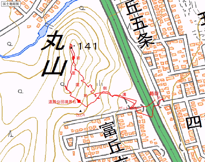 アクセス 国道5号線沿いの札幌トヨタとローソンのある交叉点から山側の富丘通を上って行き、札樽自動車道のアンダーパスををくぐるとすぐ右にフェンスが見える。そのフェンス沿いにあるバリケードの隙間から、植林地(以前はミニスキー場)を登る。 |