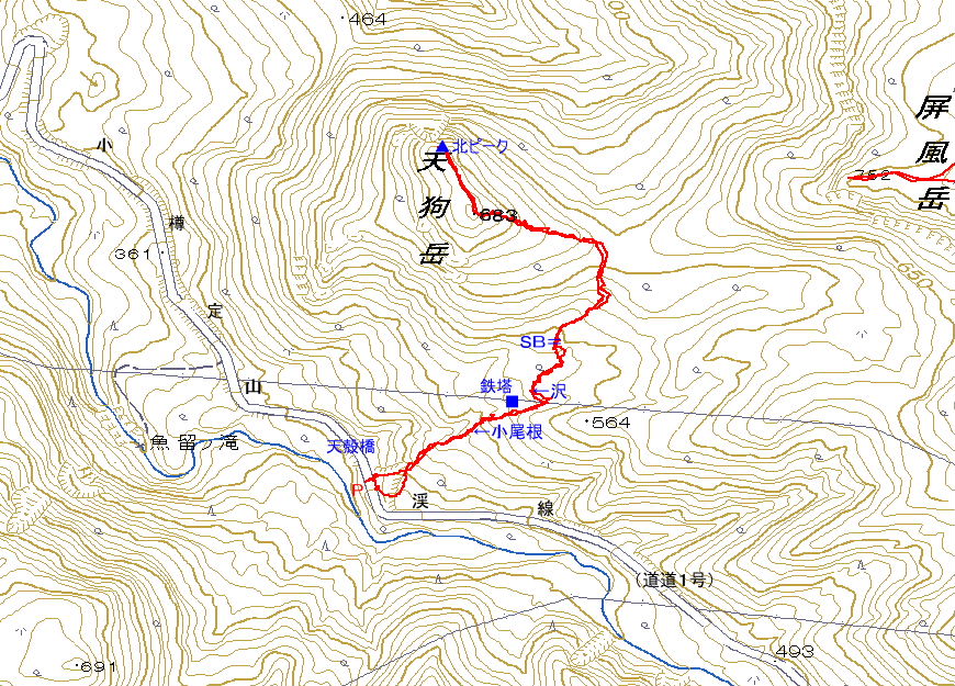 アクセス 小樽定山渓線(道道1号)の魚留ノ滝を過ぎて、天殻橋を渡ると間もなく、右に駐車スペース(5台位のスペース)がある。 国土地理院地図 Google マップ ルート図(2009.3.13)大→┃ |