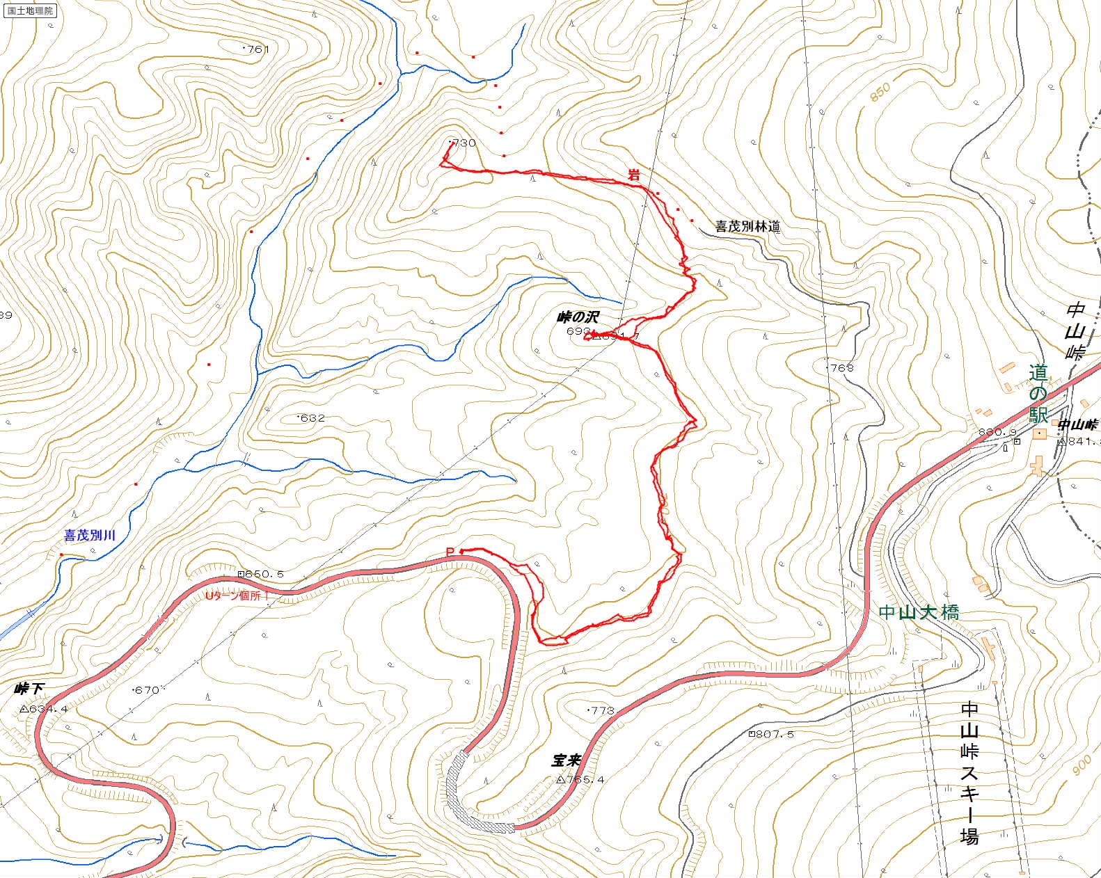 ポイント 中山峠の南に喜茂別林道があり、その道沿いに730m峰、693m峰(三角点:峠の沢691.7m)がある。 |