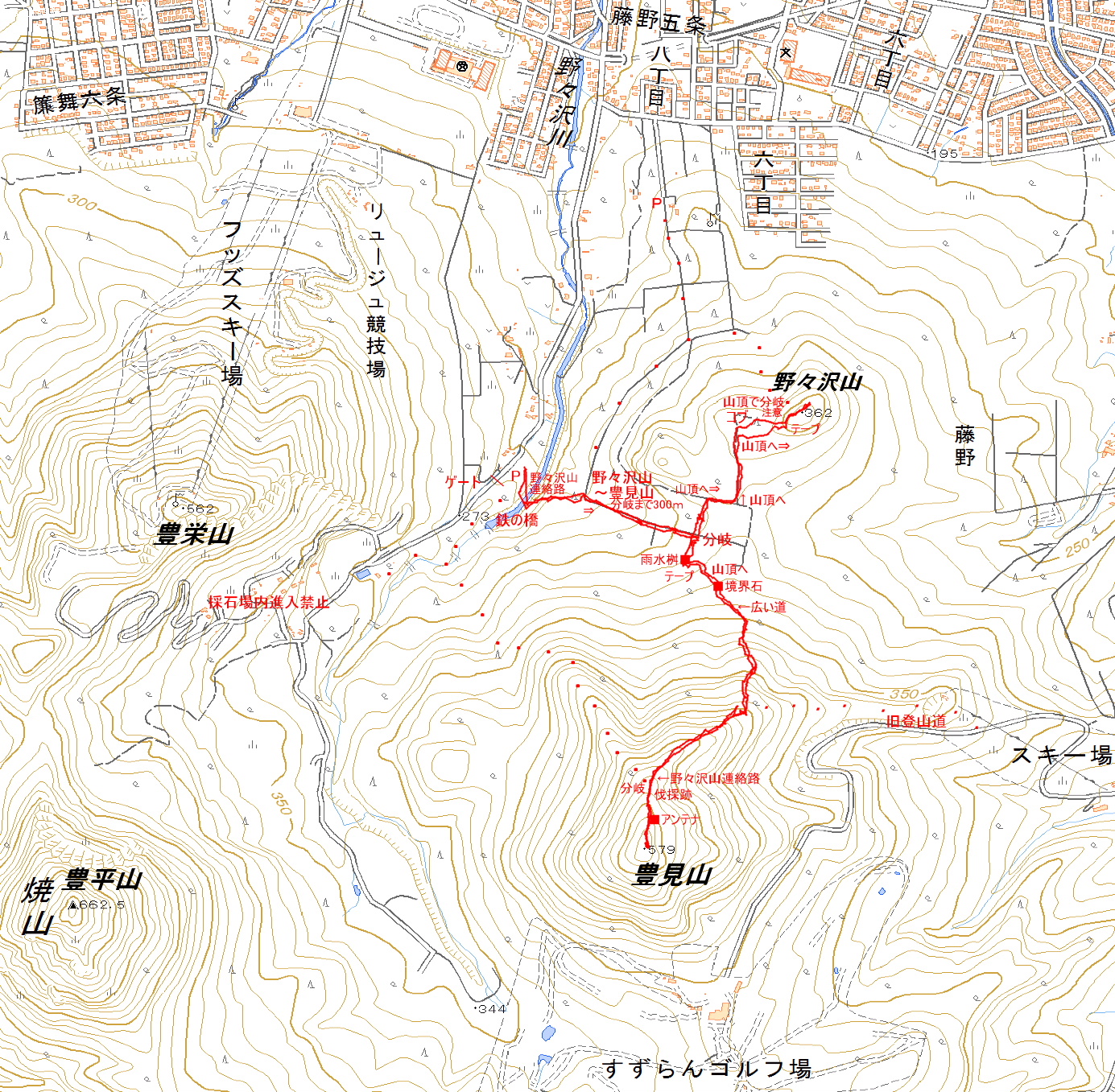 ポイント ゴルフ場道路が使えなくなったので、札幌登山道整備隊(阿部隊長)が藤野側(豊平山藤野登山口)から新たに登山道を開削した。豊見山は、藤野三豊山の山で、牧場の山とかゴルフ場の山とも呼ばれる。以前は、山頂からの展望は無かったが、現在は、木々が切り払われ支笏の山々や空沼から盤ノ沢山まで一望出来る。野々沢山との連絡路が出来た。 |