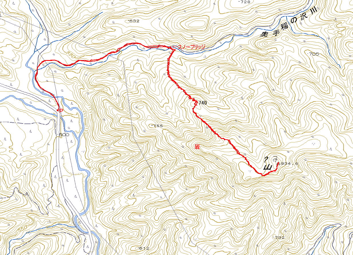| 奥手稲の沢川 | 尾根の深い雪 | 喘ぎながら登る | 730mのコブ |