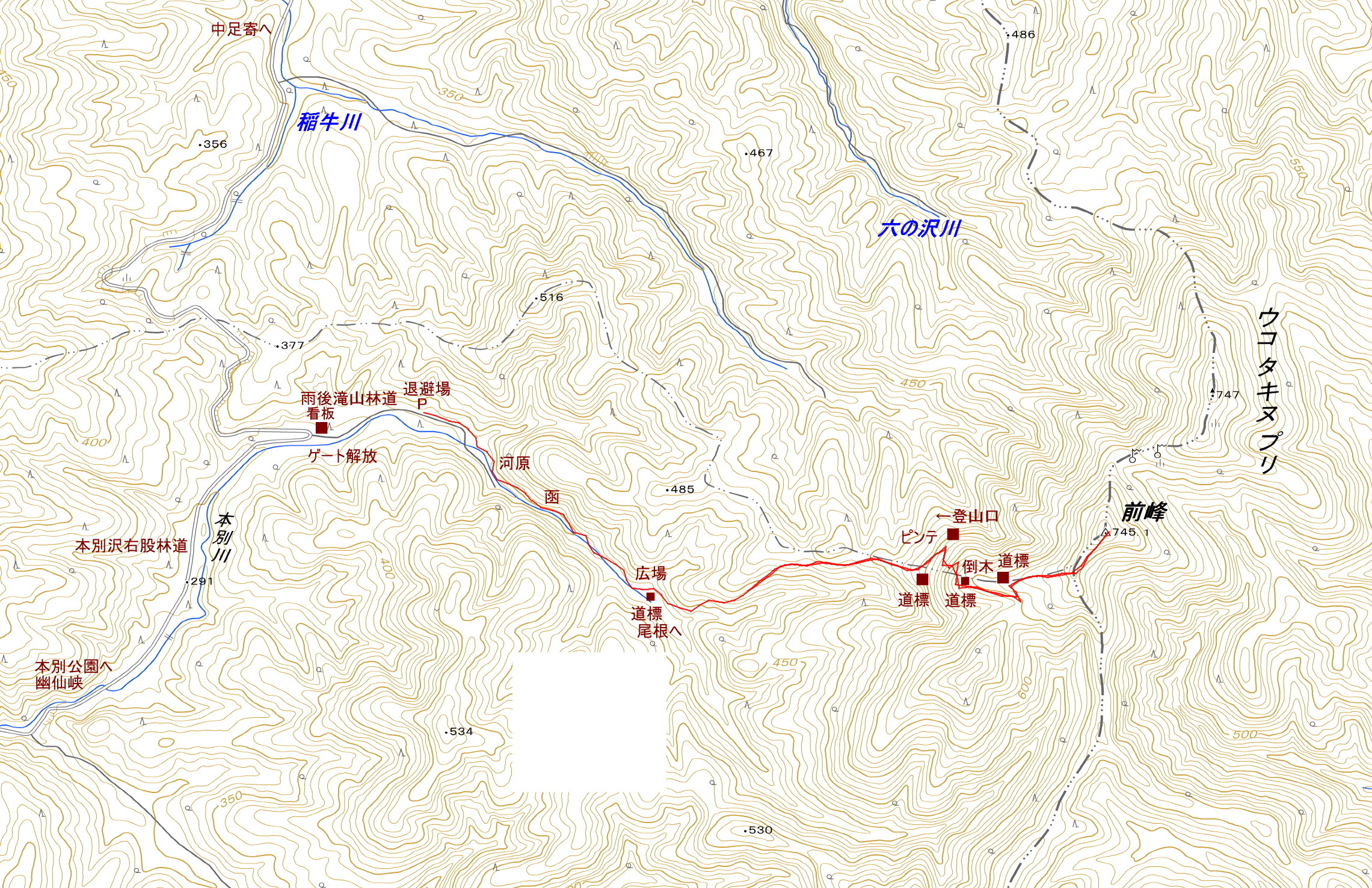 アクセス 本別町には「ウコタキヌプリ」の案内板は無いので、登山口を探すことから始まる。まず、本別市街地の裏にある本別川沿いの「本別公園」を探す。次に、その奥にある綺麗な渓谷の「幽仙峡」を目指す。途中で舗装道路が切れ、鹿柵が現れるが、柵は施錠されていないので、開閉して進む。幽仙峡には立派な東屋やトイレットペーパー付きの綺麗なトイレ(源氏台)がある。更に、「本別沢右股林道」を奥へ進むと、林道が大きくカーブするところに無施錠だがゲートの付いた「雨後滝山林道」が現れる。入口には「ウコタキヌプリ」の案内板が設置されている。 本別沢右股林道は中足寄にも抜けることができるようだ(長い林道走行なのでエスケープルートとして心強い)。 国土地理院地図 Google Map 登山道地図クリック大→| |