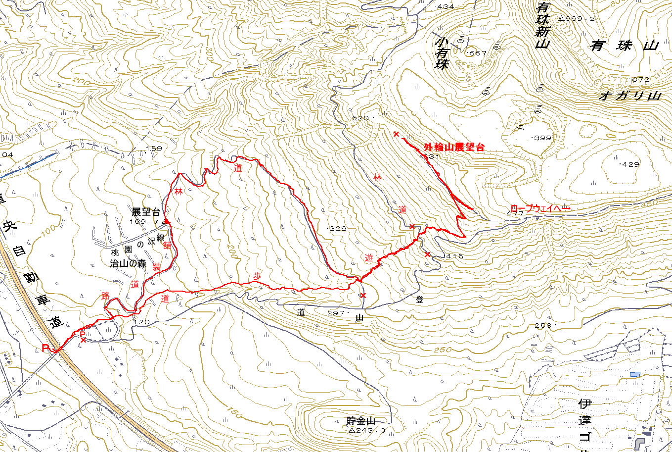 | 目の前に舗装道路が現れて、その道端に、治山の森の看板が立っている。古い治山の森の看板の方が地図には忠実になっているが、掠れて見えないと所がある。遊歩道には行かずに、治山の森の中に延びる舗装道路を辿って行く。今日は、治山の森の中にある展望台へ寄って見るためだった。 途中で、遊歩道への小道を2か所通過しながら登って行くと、犬を散歩しながら男性が下って来た。リードを外しているので、犬の方が先にわれわれに近づいて来た。真っ直ぐ、愛棒に近づいたので雄犬だろうかと確認する間もなく、男性が恐縮して近づいて来た。この男性に展望台のことを聞くと、もう、朽ち果ててしまって跡形も無いという。 それでも、三角点「展望台」を目指して登って行くと、舗装道路が下りだし、砂利道が真っ直ぐ延びている分岐になる。このところに展望台があったろうと思いながら、反対側に看板が立つ一角の草むらに三角点を見付ける。三角点を見付けて、このまま、林道を辿って登ろうと思ったら、工事中で立ち入り禁止の看板が架かっていた。仕方が無く、戻ろうかとおもったら、丁度、車が到着して、中から工事関係者が降りてきたので、入れないかと聞いてみた。すると、東北訛の男性が良いと言って、工事の邪魔にならない所まで案内してくれた。久しぶりに心地よく心に響く東北弁を楽しみながら、感謝して分かれる。右の工事現場から分岐する左側の道を辿って行くと、林道はジグを切り出す。愛棒はジグの先がどうなるのか不安そうに辿っていた。 |