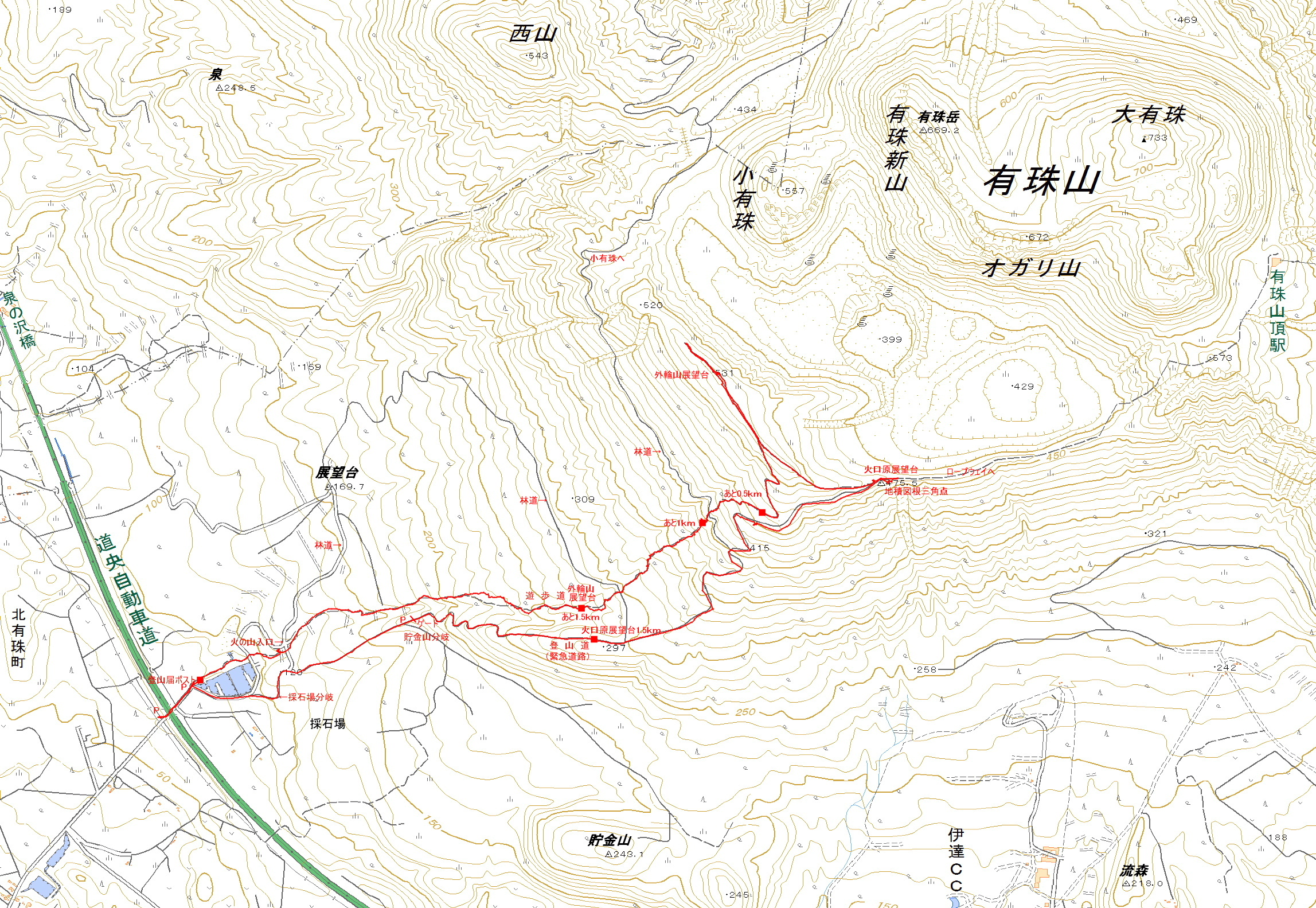 | 有珠湾 | 登山道を | 火口原展望台1.5km | 分岐 |