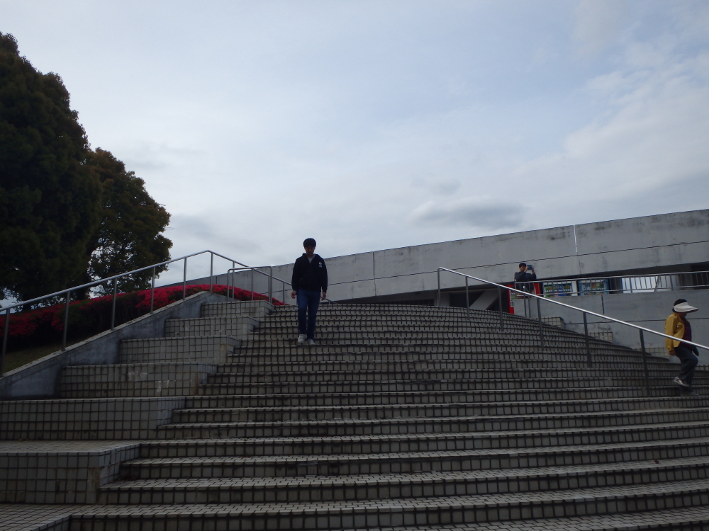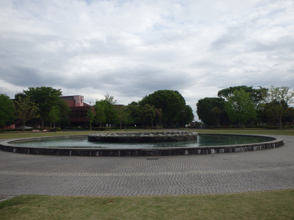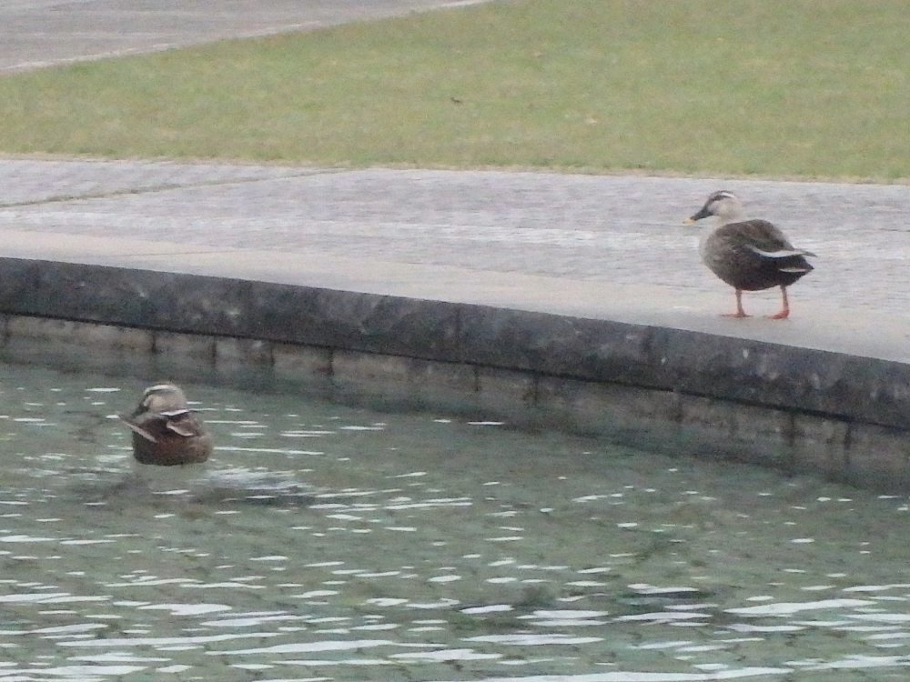 | 駐車場から円い中心広場に行くと、真ん中に二重円の池があり、カモがのんびりと動いていた。競技場をみようと階段を上がると、トラックが見えて来る。 |