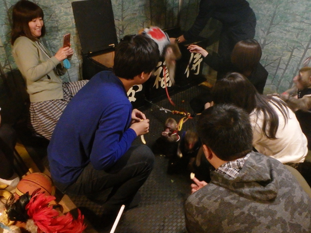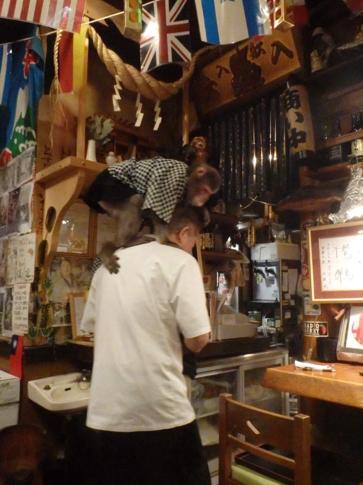 | サルが接待する居酒屋として有名なので暖簾を潜る。飲食をしながらサルの出番を待つ。食事が終え夢福侍と書かれた黒い長椅子に座って待っていると、サル達が続々と出てきた。肩に登ったり、膝に上がったり、抱っこされたりとフレンドリーだった。壁の色紙には「野生のお猿が/働くお店/おしぼり一本が/世界へ」と記されていた。客席には来客記念の写真が所狭しと飾られていた。店主の肩にもサルが載っていた。天井には万国旗が掲げられている所を見ると、外人さんにも人気があるようだ。神棚のごぼうの紙垂(しで)は3枚しかなく、サルが一枚取ったのではと思う。大事に額に入れている色紙もある。よく見ると「鷙鳥不群(しちょう ぐぐん ならず)/平成二十七年三月/国務大臣石破茂」と読めた。この店は一匹の鷹ではなく、群れるサルで持っているのにと思う。私なら月並みだが「群猿来客」かな。この店は2025年7月に閉店したようだ。残念! |