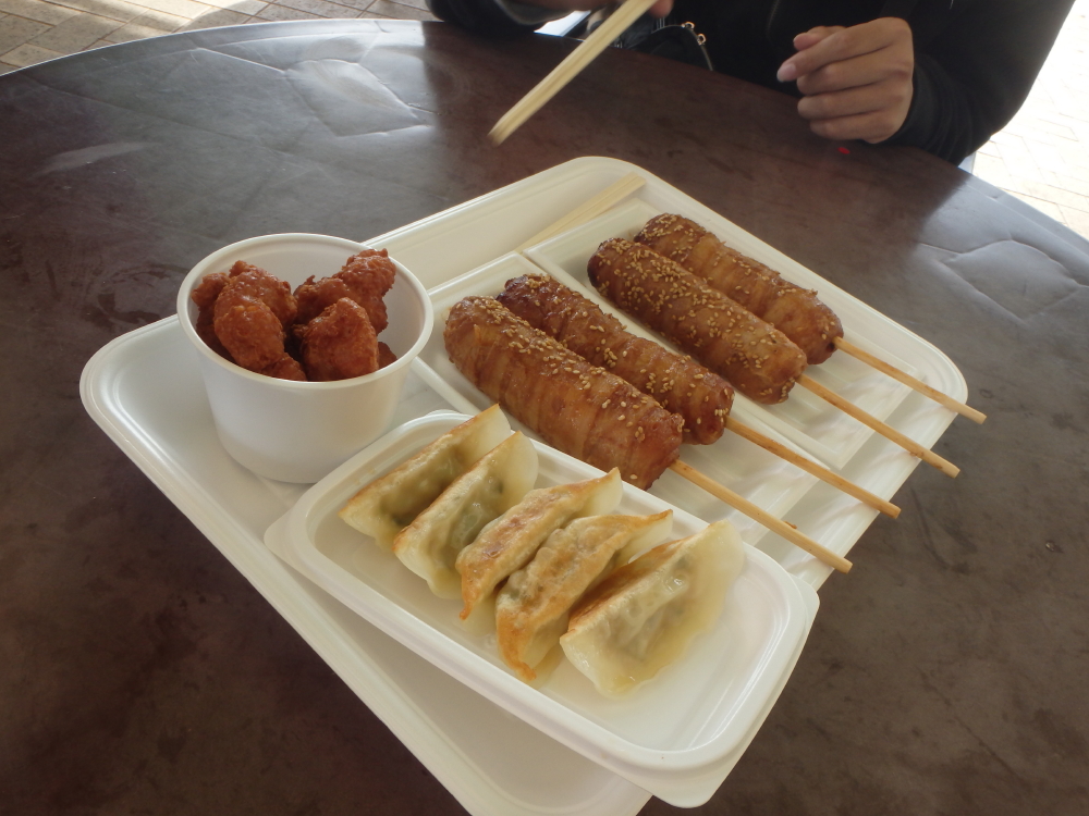道の駅で、餃子、鳥の唐揚げ、ホットドックを食べる。 |