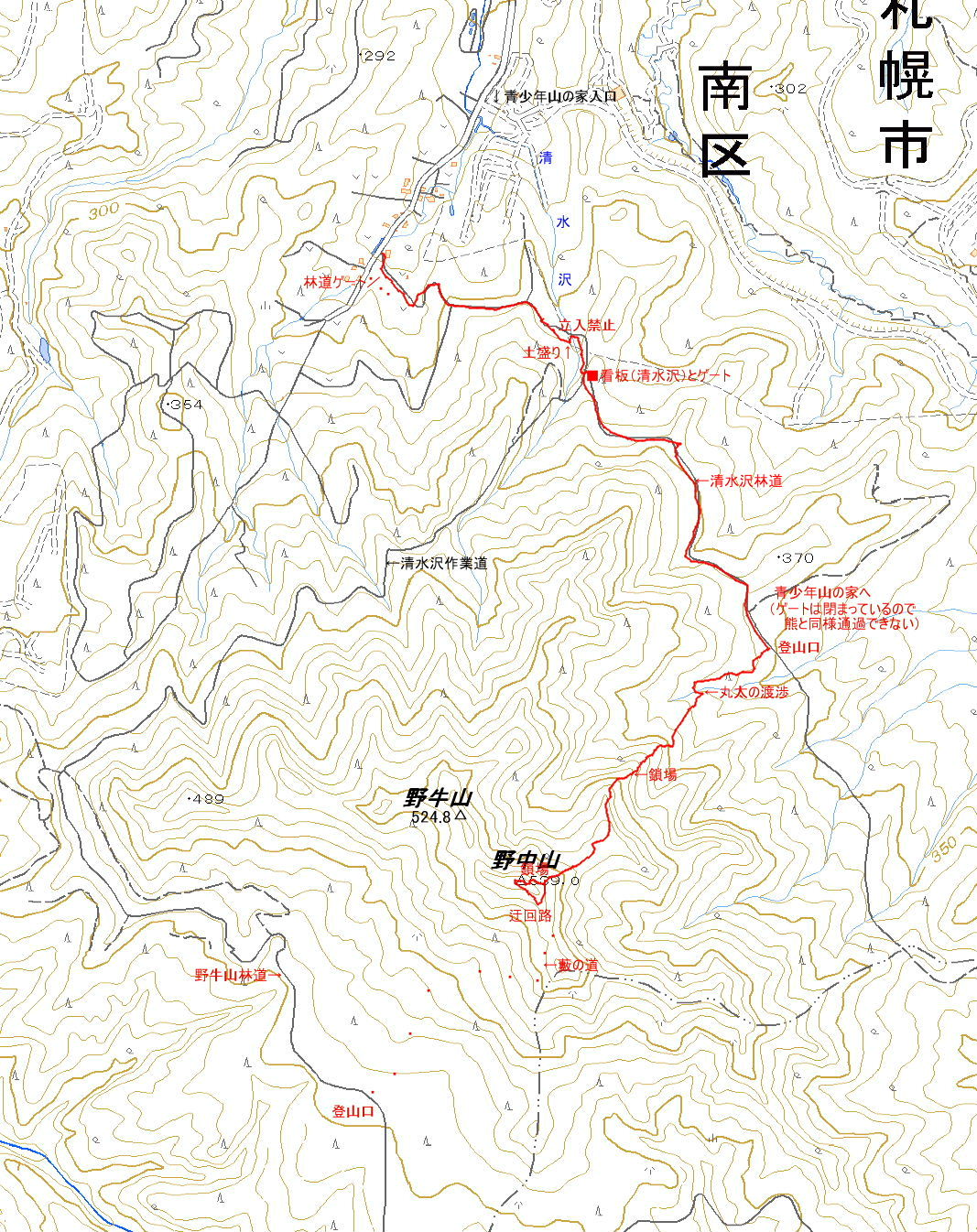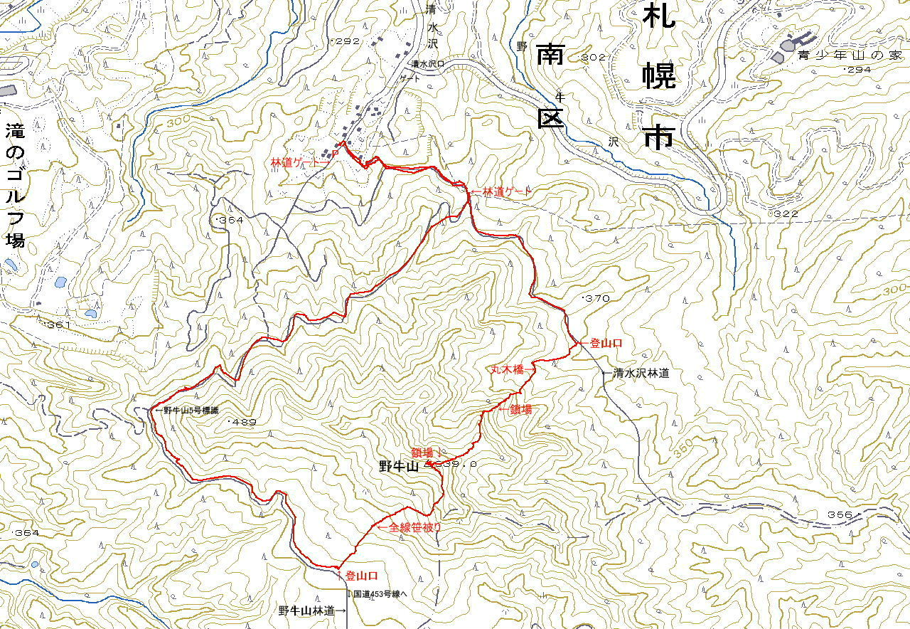 ポイント 札幌市街が辛うじて一望できる(以前は、支笏湖や定山渓の山々も木立越しに見えた)。一般道から林道へ入る場所には標識は無く、林道内に登山口の道標が立っているのみ。登山口は、北口(清水沢林道)と南口(野牛山林道)があったが、南口は廃道になっている。山頂には三角点:野中山539.0mがある。 国土地理院地図 Google マップ |